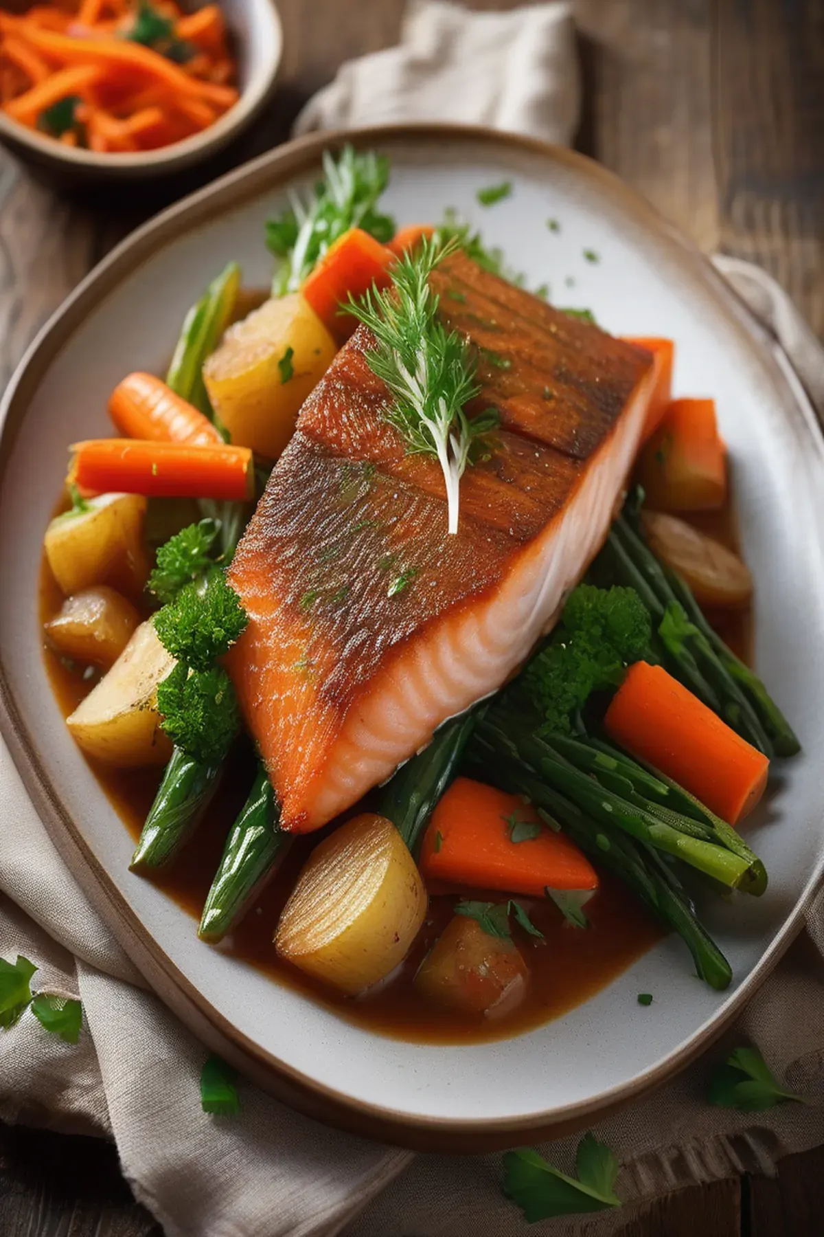 Add the fish fillets, carrots, potatoes, dill, salt, and black pepper.