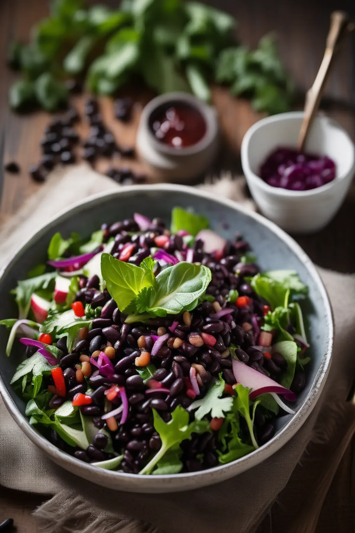 A flavorful and refreshing salad featuring black beans, mixed greens, and a zesty French dressing.