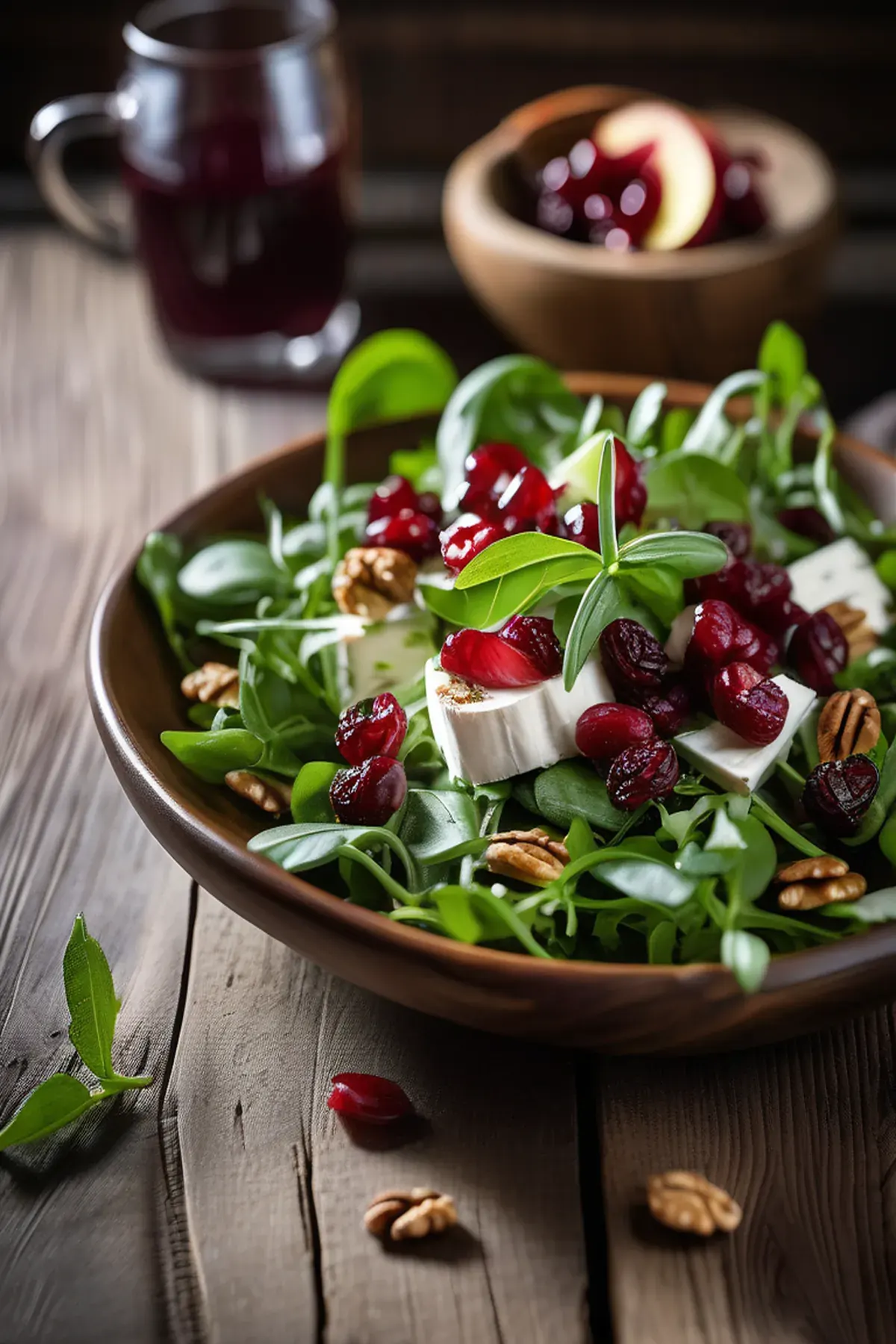 A refreshing mix of goat cheese, greens, and sweet fruit, perfect for a light lunch or dinner.