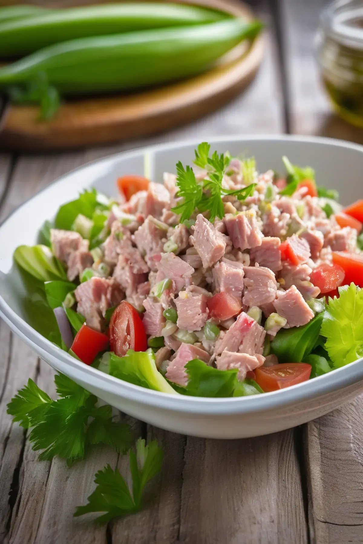 A refreshing salad with creamy mozzarella, juicy tomatoes, and crunchy Mediterranean vegetables.