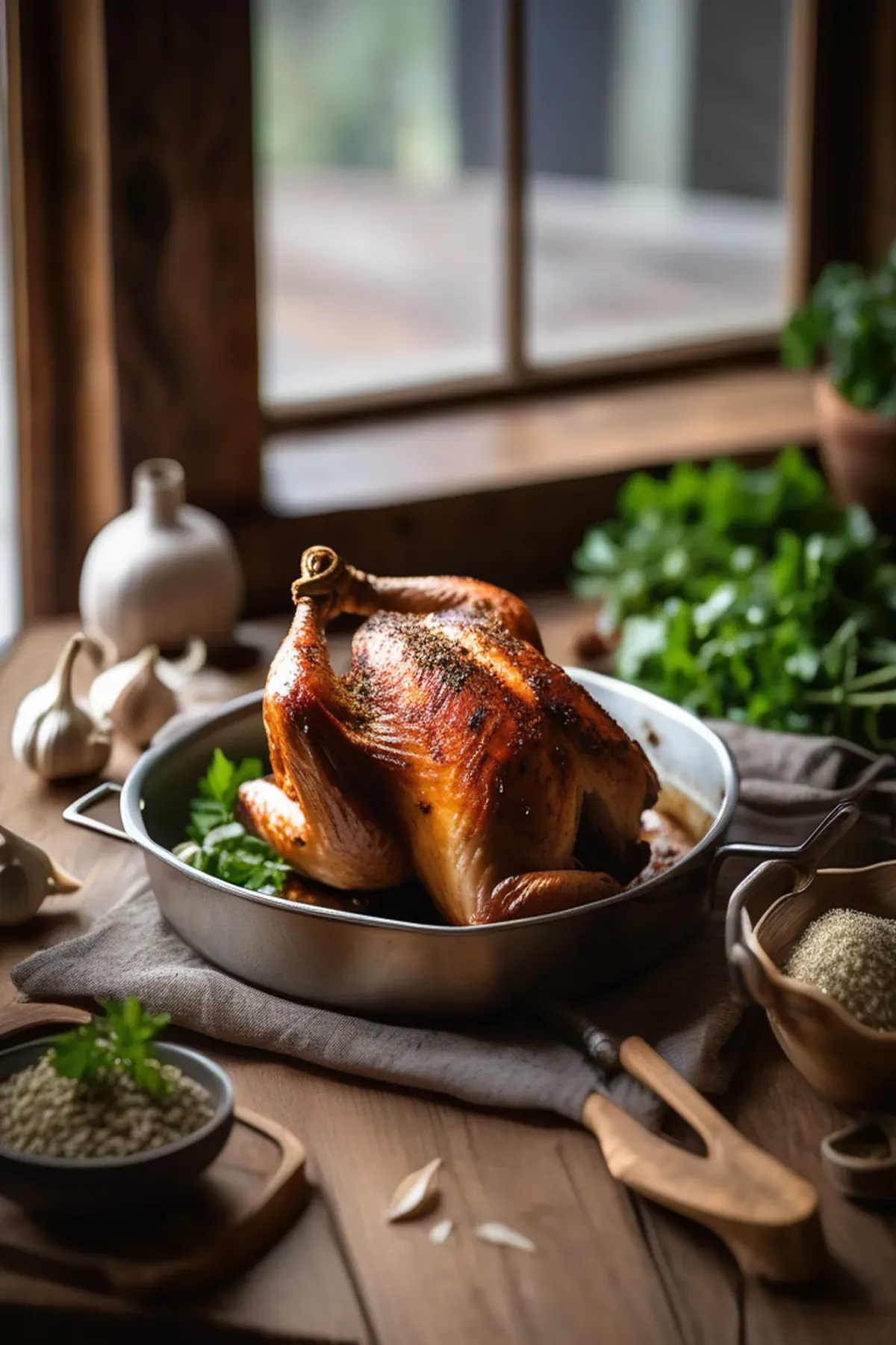 Uncover, spread the remaining garlic-oregano butter on the chicken and turn chicken once more skin-side down.