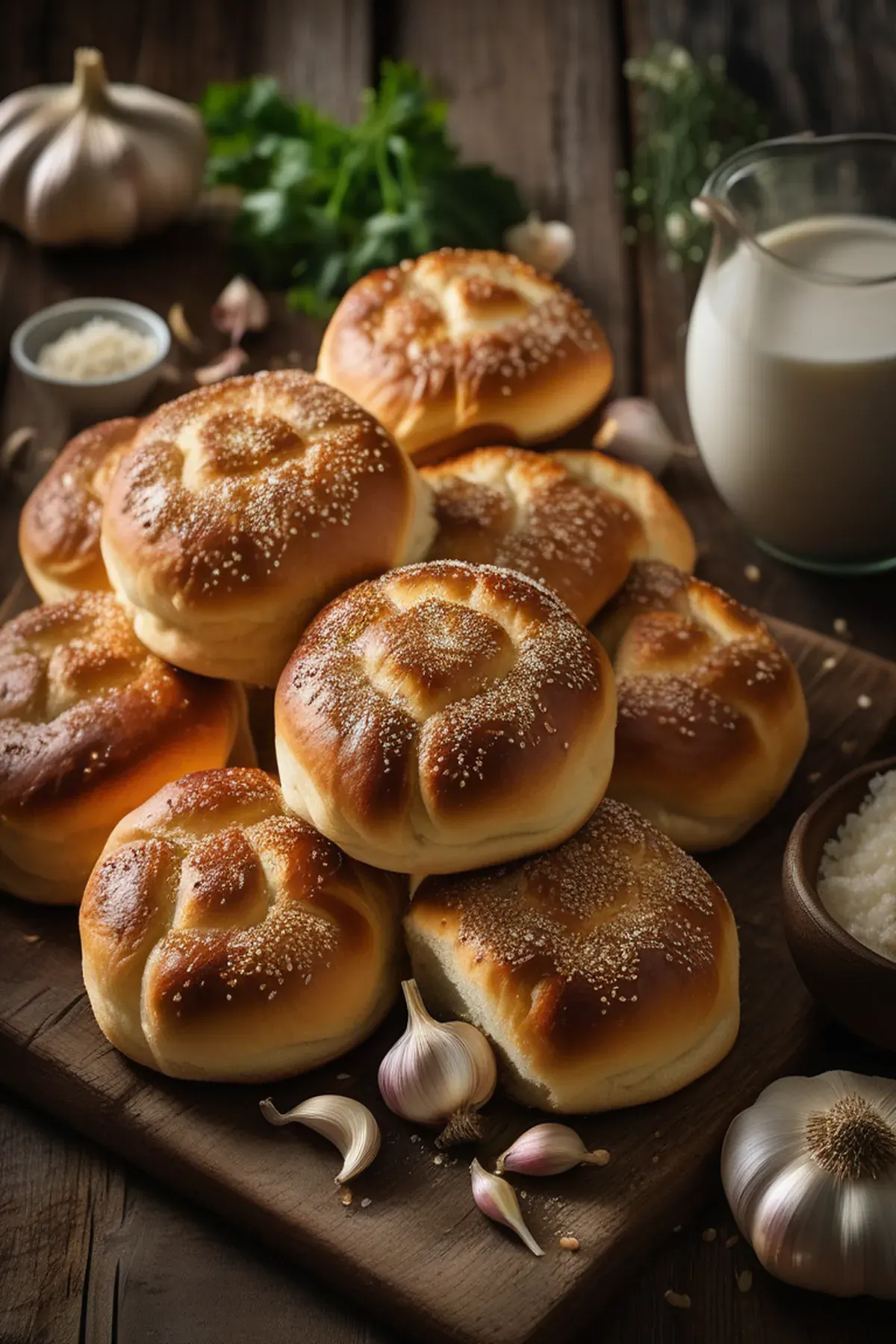 Soft, pillowy buns infused with aromatic roasted garlic and herbs, perfect for soaking up gravies or enjoying as a standalone treat. Golden-brown on the outside and tender inside, these buns are a showstopper at any table.