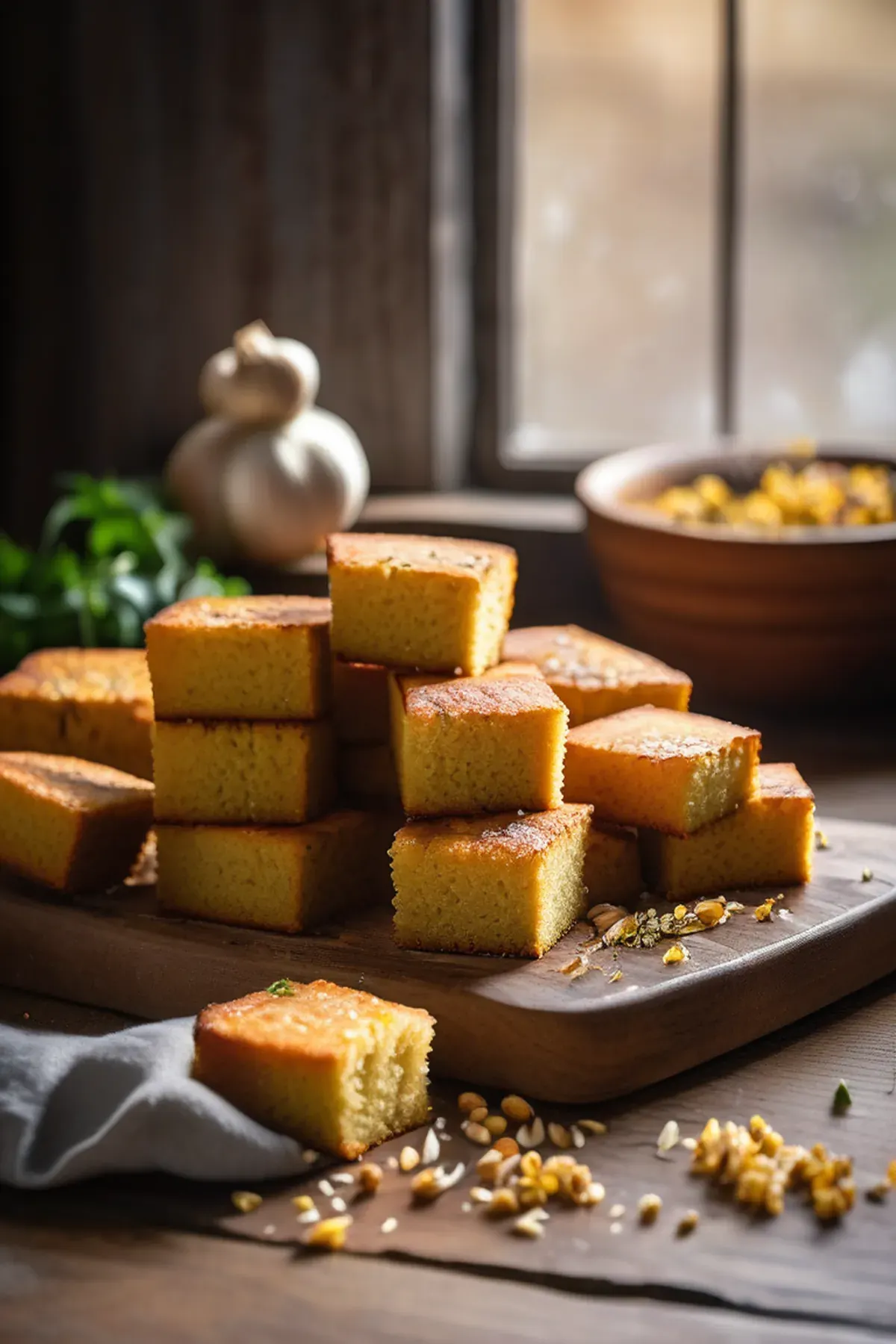 Golden, moist cornbread infused with roasted garlic and fresh herbs, with a delightfully crispy exterior and tender crumb. Perfect as a savory side dish or enjoyed warm with butter.