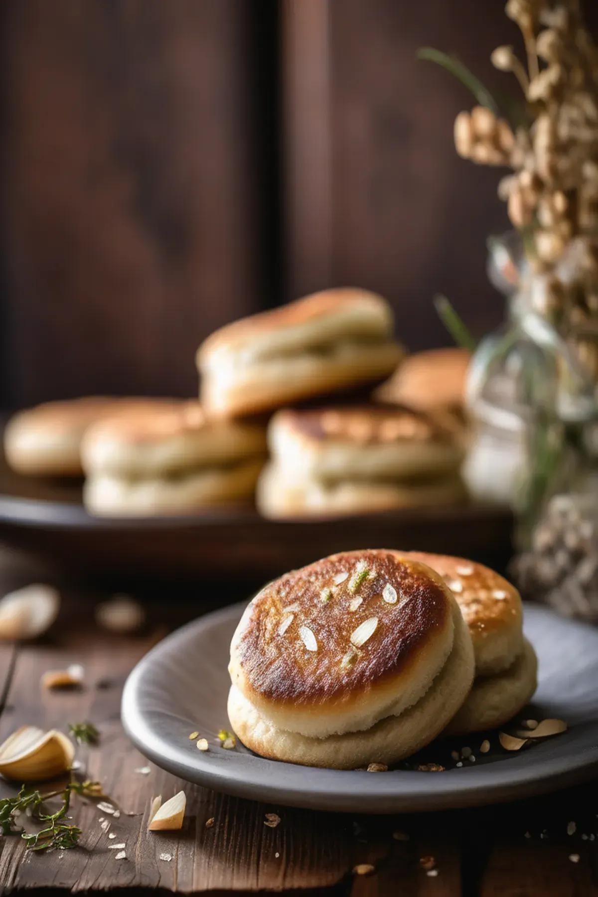 Soft, pillowy English muffins infused with roasted garlic and herbs, perfect for toasting and spreading with butter or your favorite toppings.