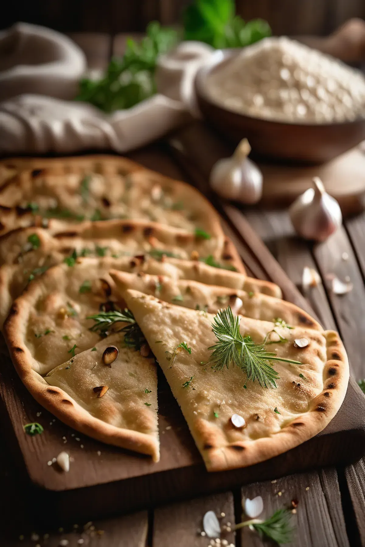 A crispy and aromatic flatbread infused with roasted garlic, olive oil, and fresh herbs that's perfect for dipping or serving alongside any meal.
