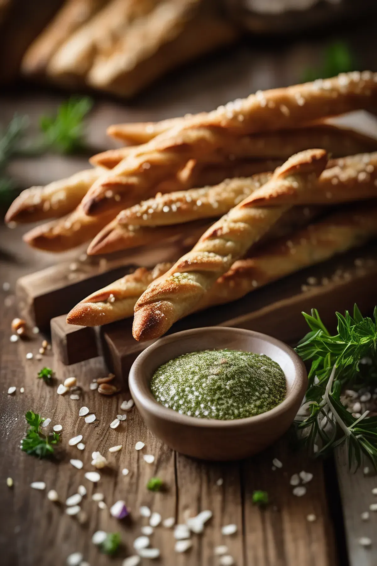 Place breadsticks on a baking tray lined with parchment paper, leaving 2cm between each one. Brush lightly with remaining garlic oil and sprinkle with coarse sea salt.