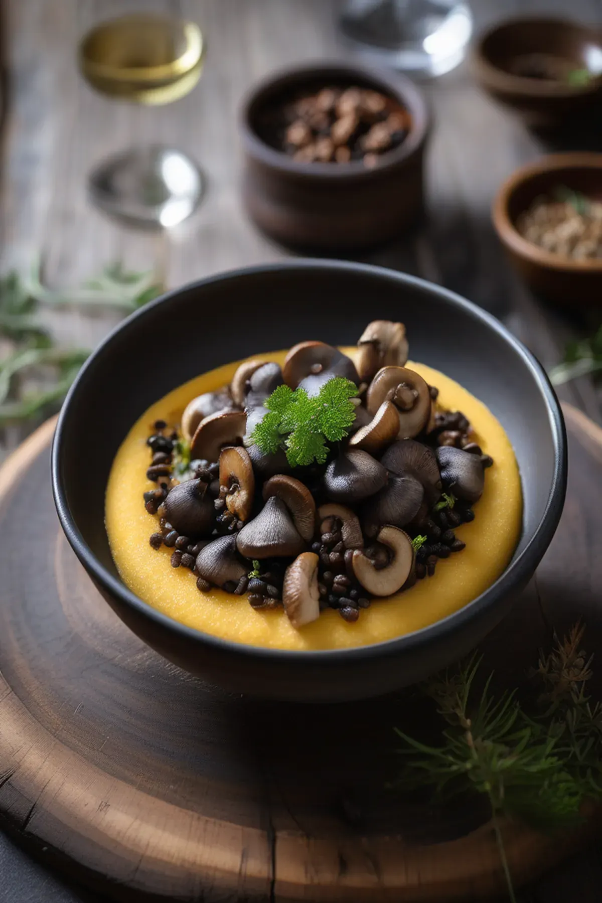 Garlic mushrooms, beluga lentils and polenta