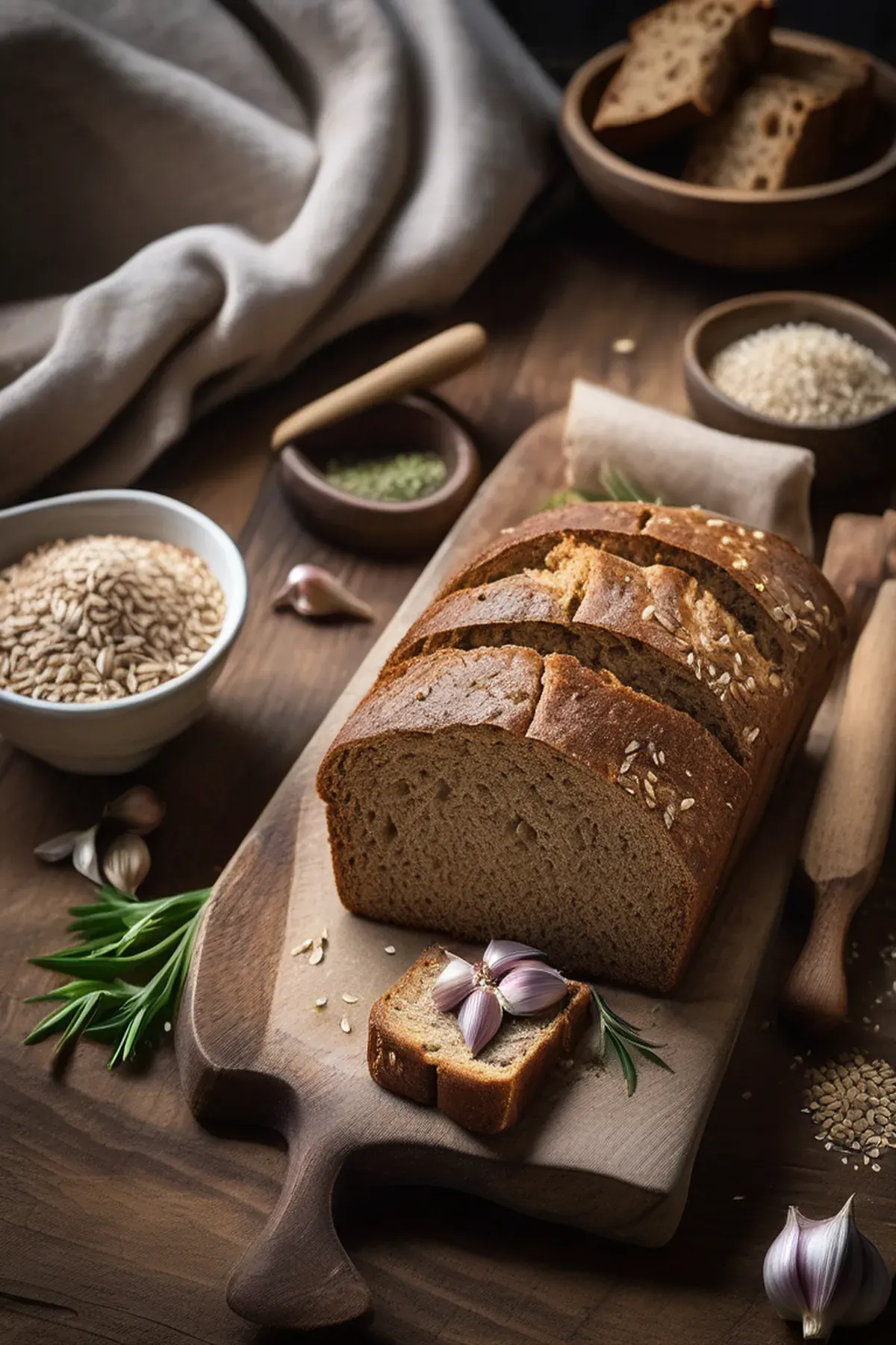 A rustic, aromatic loaf infused with roasted garlic and fresh herbs, featuring a hearty wholemeal base with a wonderfully crispy crust and soft, flavourful interior.
