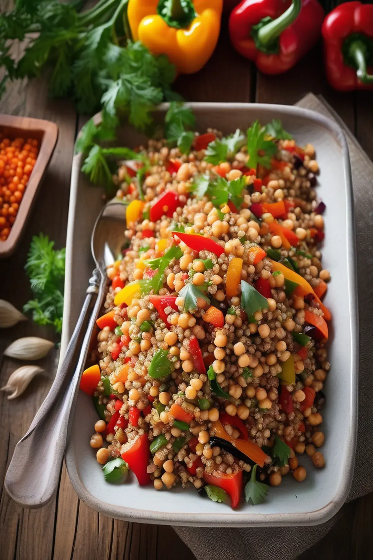 A simple and flavorful salad made with quinoa, vegetables, and a tangy dressing.