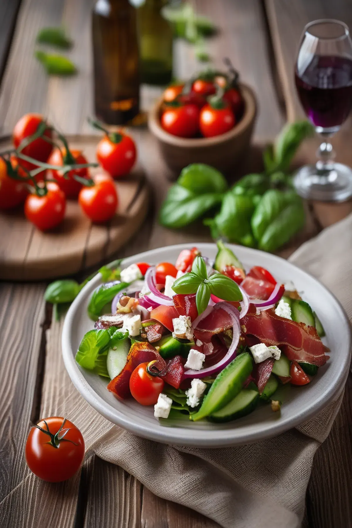 A refreshing salad of crispy bacon, juicy tomatoes, and tangy feta, perfect for a quick lunch or dinner.