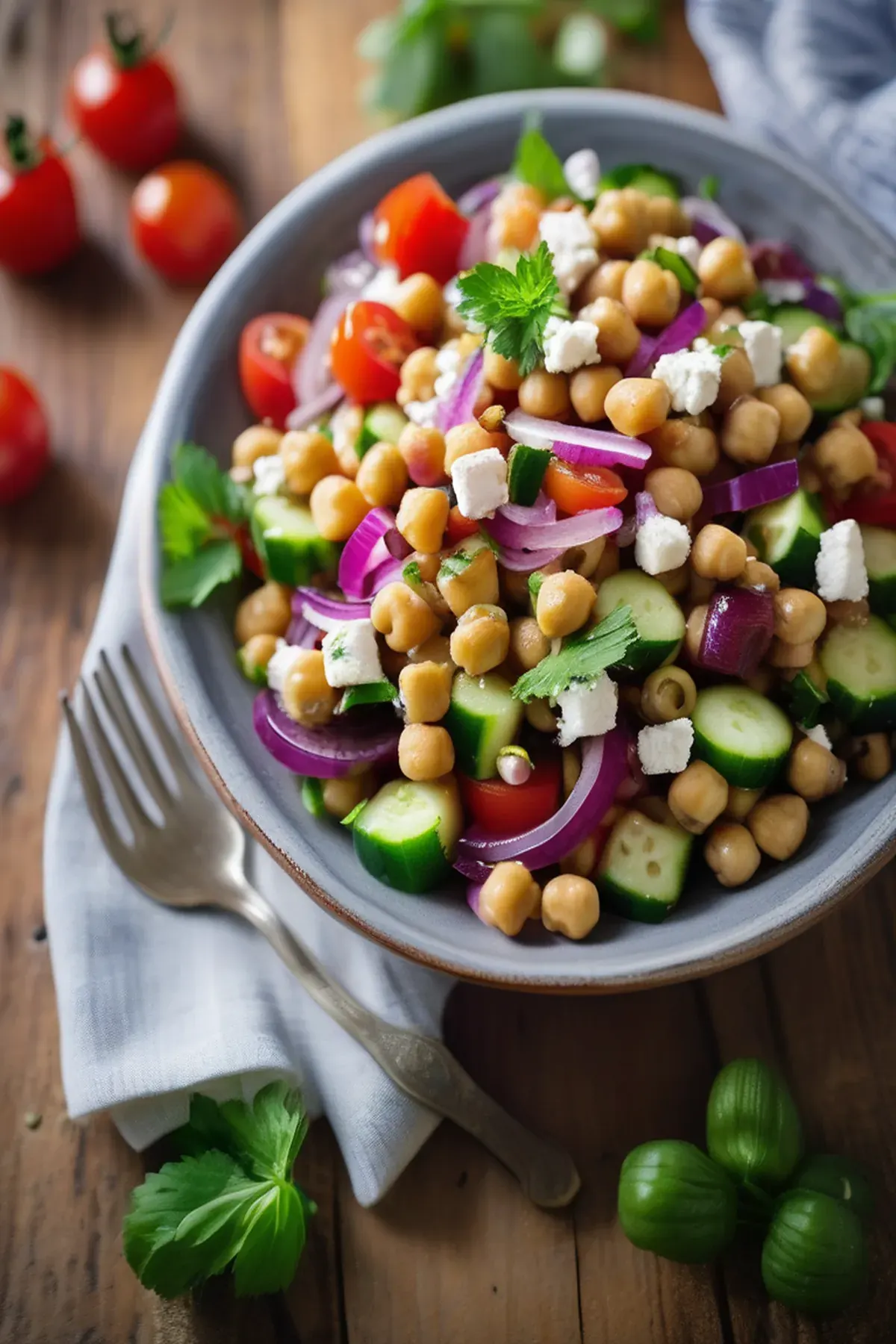 A refreshing salad with chickpeas, feta, and tangy Greek dressing.