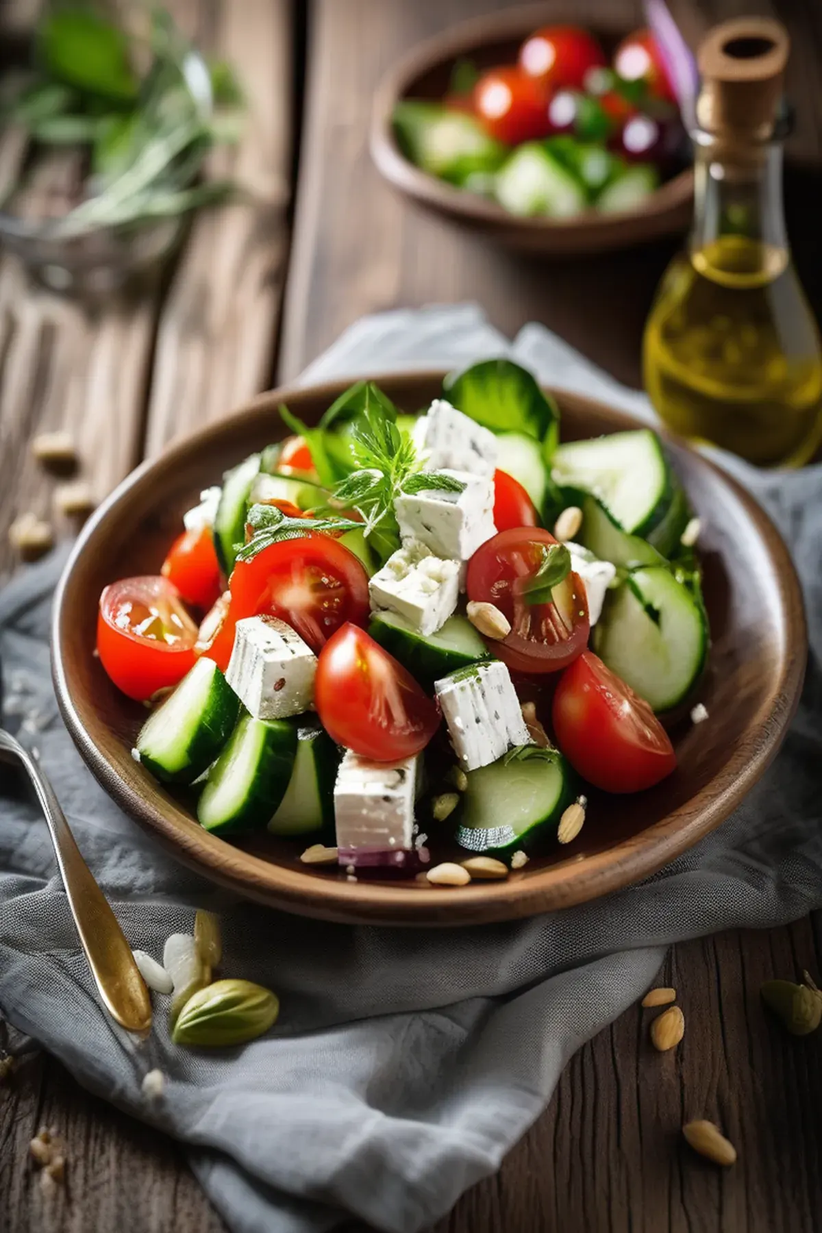 A refreshing salad featuring crumbled feta cheese, juicy tomatoes, and crunchy cucumbers, all tied together with a zesty Greek vinaigrette.