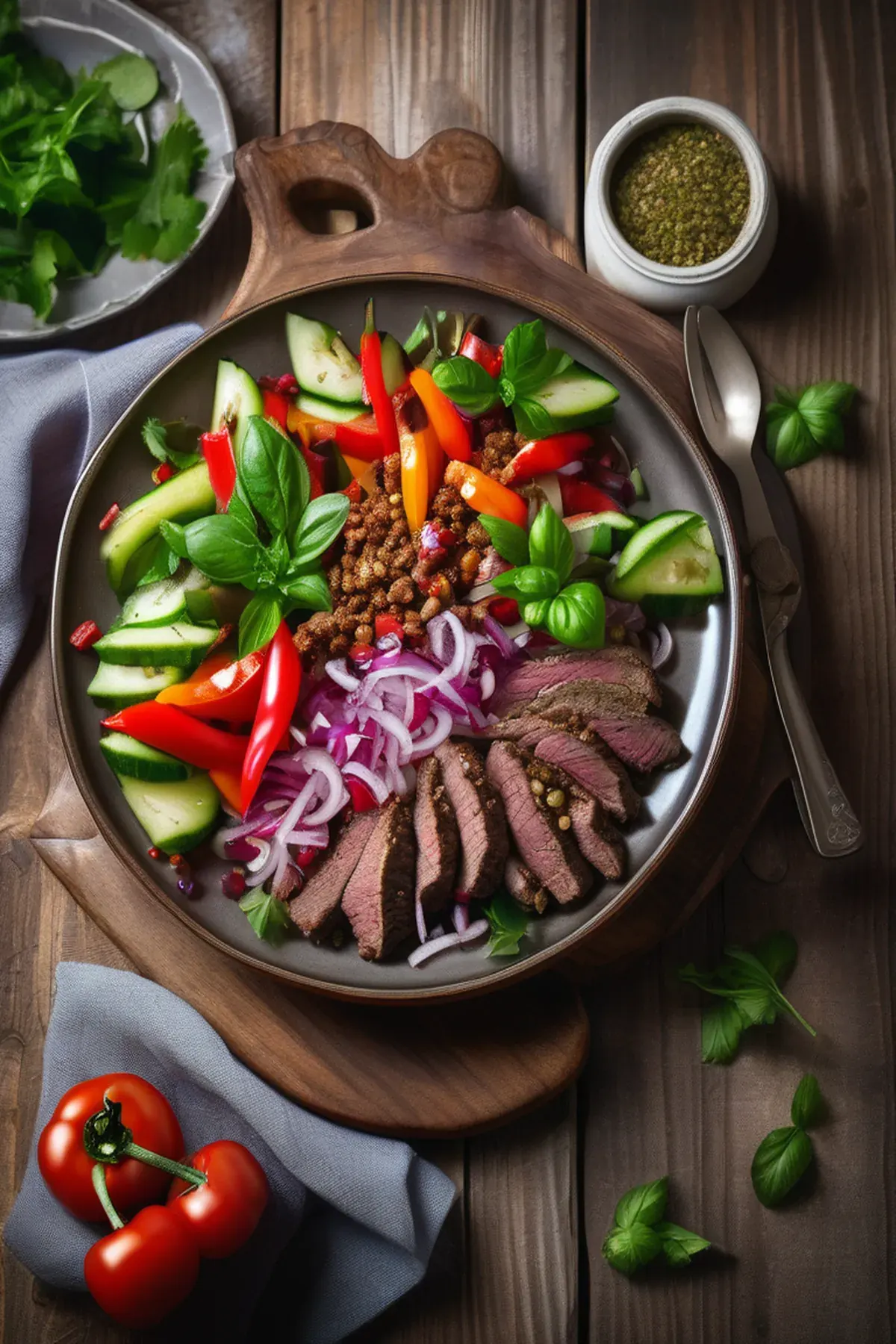 A refreshing salad combining juicy lamb with crunchy vegetables and zesty feta cheese, perfect for a light dinner or picnic.