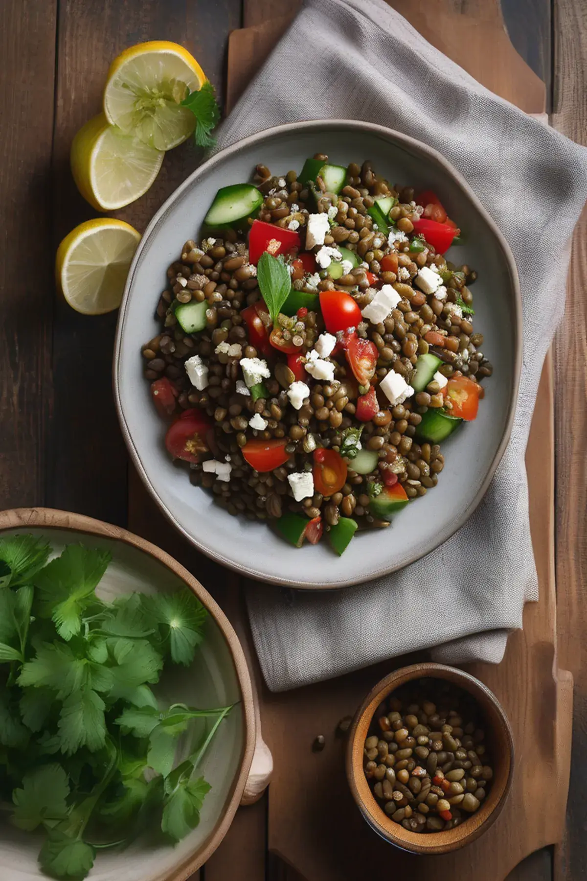 A hearty and refreshing salad featuring the rich flavors of lentils, tomatoes, and cucumbers, all tied together with a zesty Greek dressing.