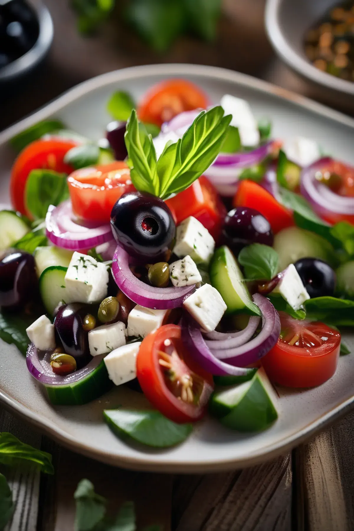 A classic Greek salad with a twist, featuring creamy mozzarella and a zesty dressing.