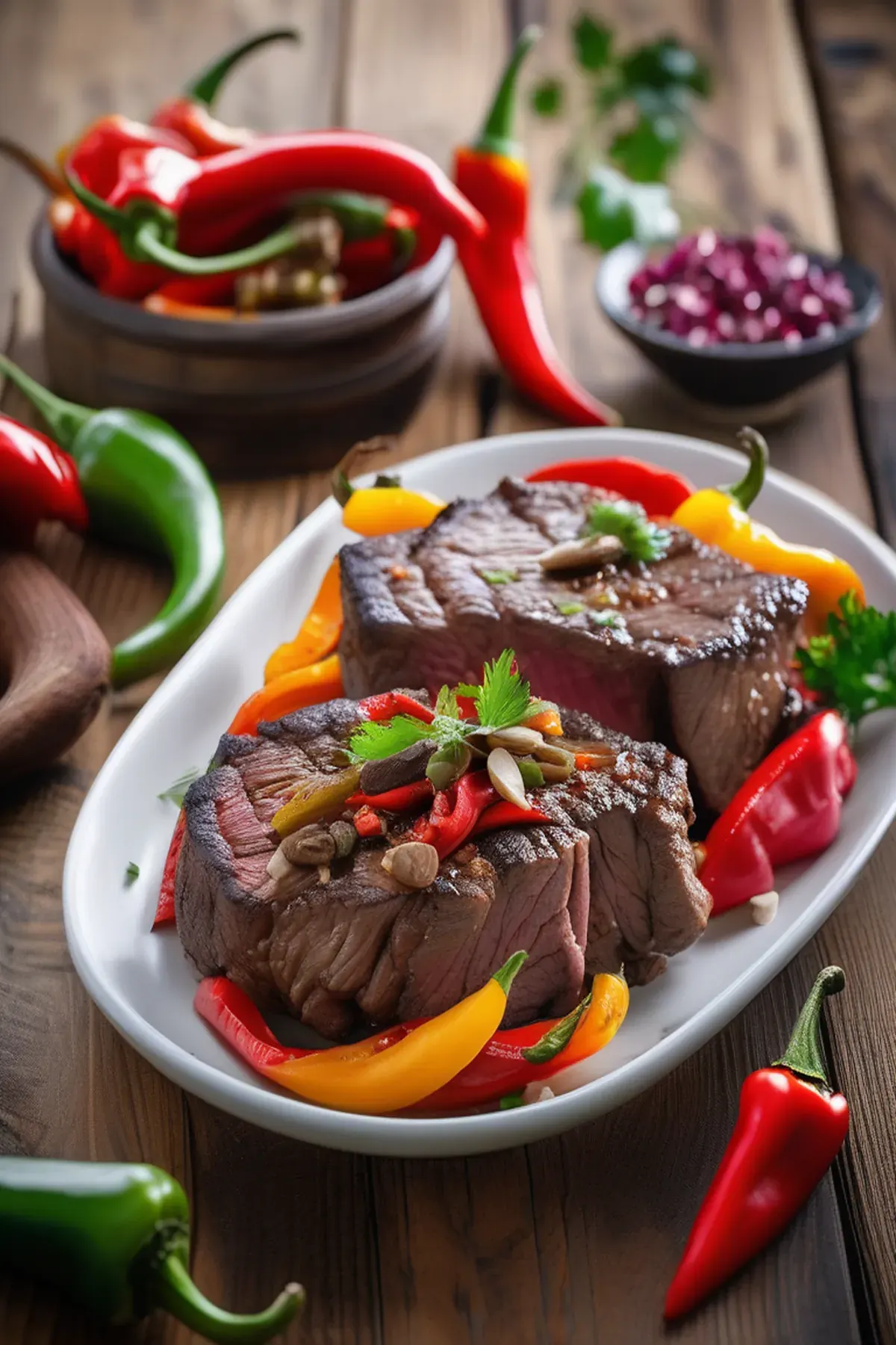 Serve the steaks alongside the charred peppers, drizzling any pan juices over the top for extra flavor.