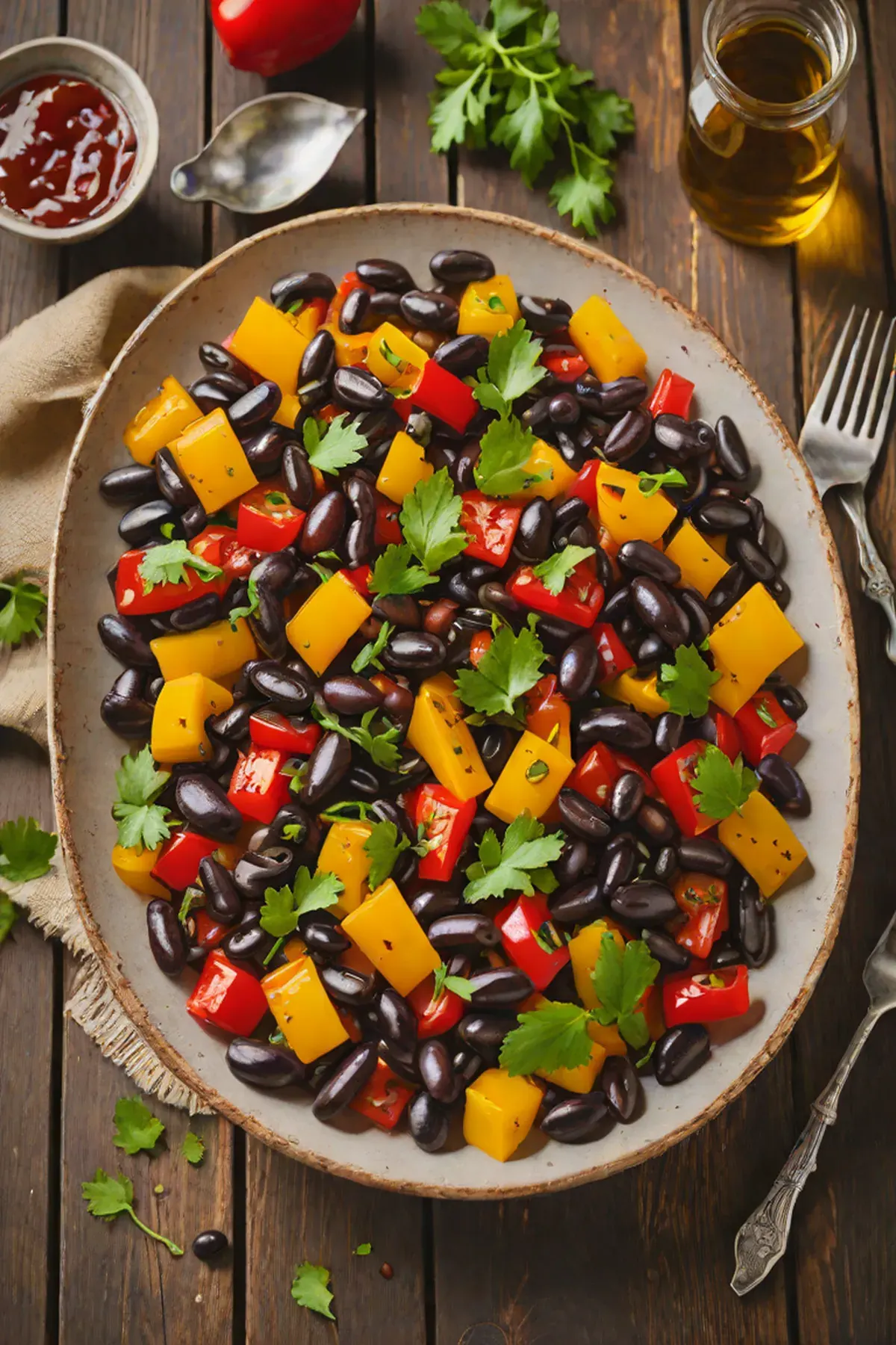 In a large bowl, combine the black beans, bell pepper strips, and onion rings. Drizzle with 2 tablespoons of olive oil, then sprinkle with smoked paprika, cumin, minced garlic, salt, and pepper. Toss gently until everything is evenly coated.