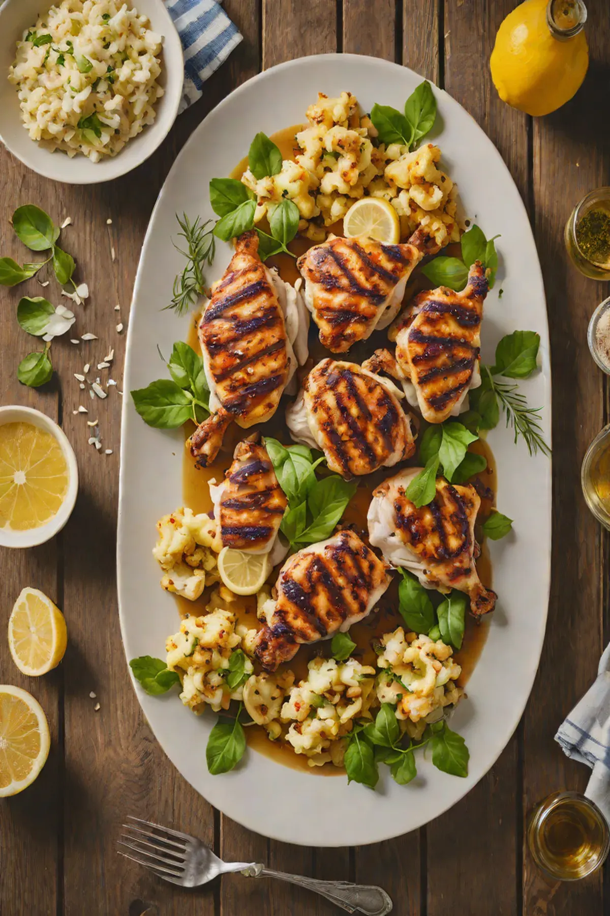 Arrange grilled chicken and cauliflower on serving plates, drizzle with the warm lemon-garlic butter sauce, and garnish with fresh chopped parsley before serving.