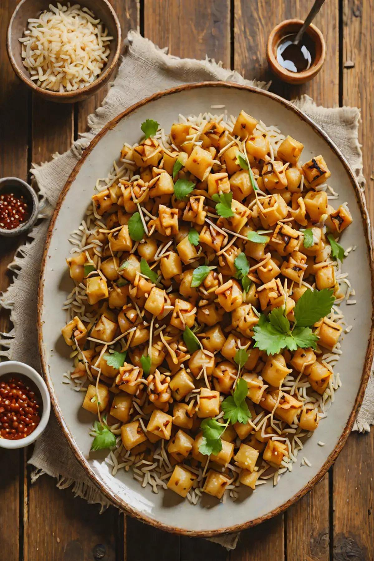 In a large bowl, toss the patted-dry chickpeas and bamboo shoot strips with half of the glaze mixture, coating evenly.