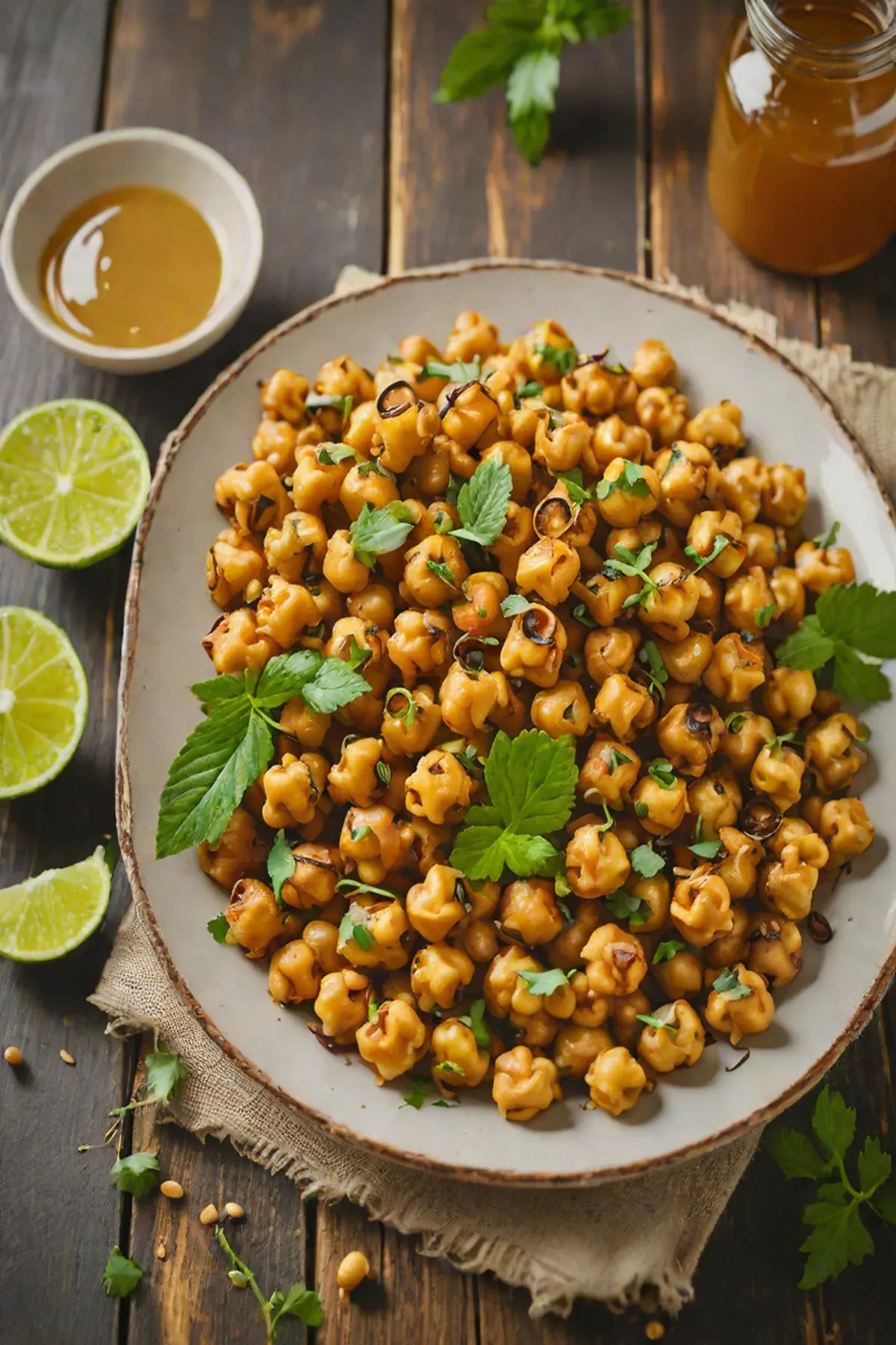 Add the dried chickpeas to the oil and ginger mixture, then sprinkle the spice blend over them. Toss vigorously until every chickpea is evenly coated with the marinade and spices.