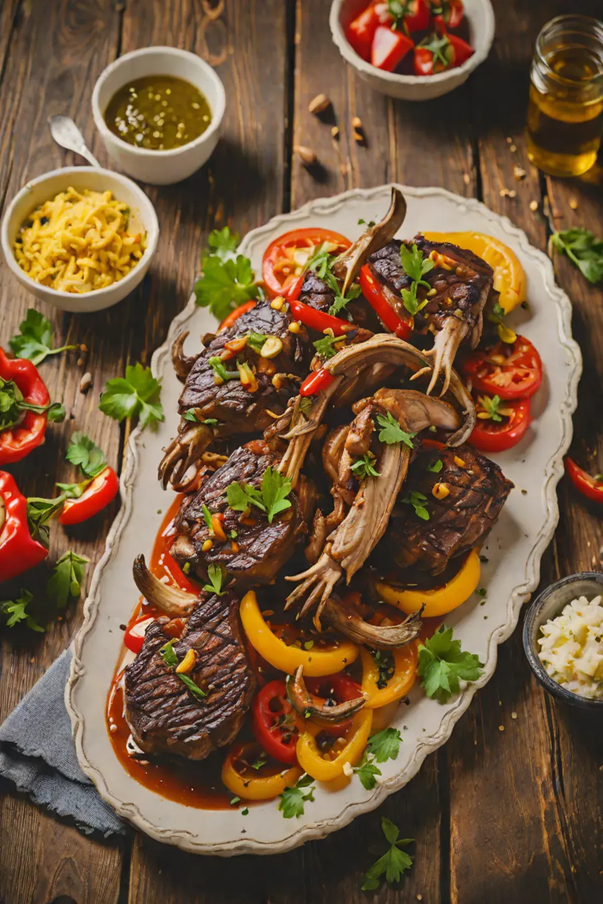 Serve grilled goat and bell peppers garnished with fresh parsley.