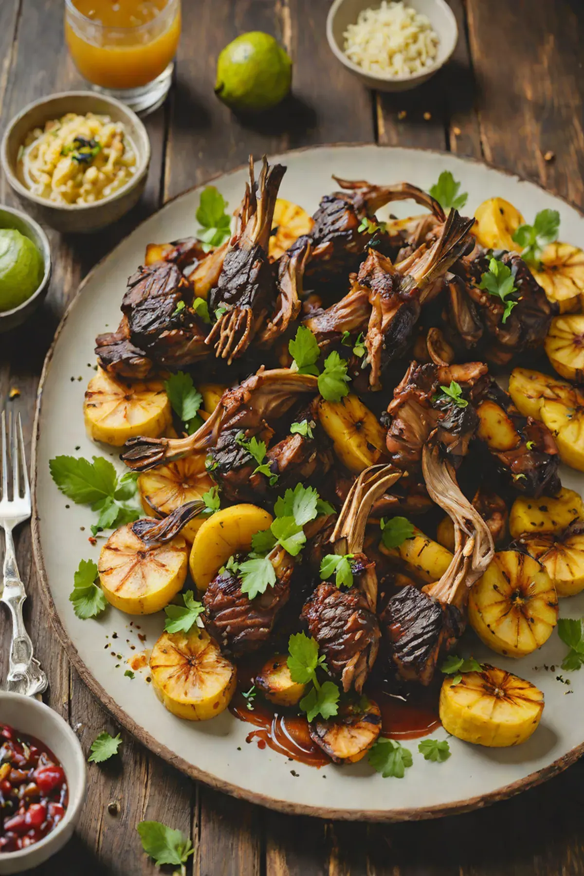Garnish the grilled goat with coriander leaves and serve with the caramelized plantains.