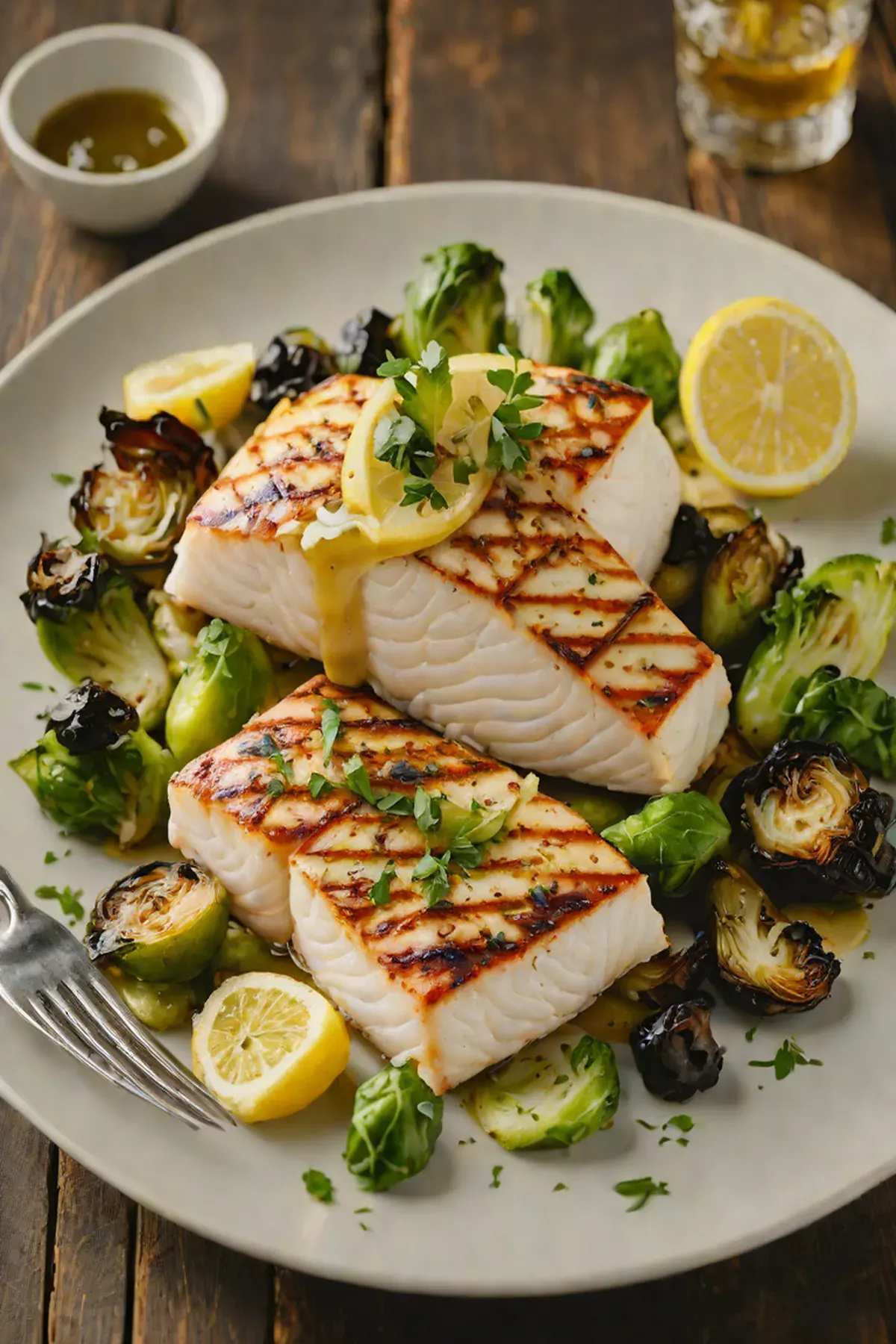 This is one of my favorite weeknight dinners because it comes together in under an hour and feels fancy enough to impress guests. Halibut is a lean protein packed with omega 3 fatty acids, which are wonderful for heart health, and the fish gets beautifully flaky when grilled. What I love most is the simplicity of it all: you just need quality ingredients and good timing. The charred brussels sprouts add a wonderful caramelized sweetness that plays perfectly against the bright lemon butter sauce. Trust me, this elegant meal is far easier than it looks.
