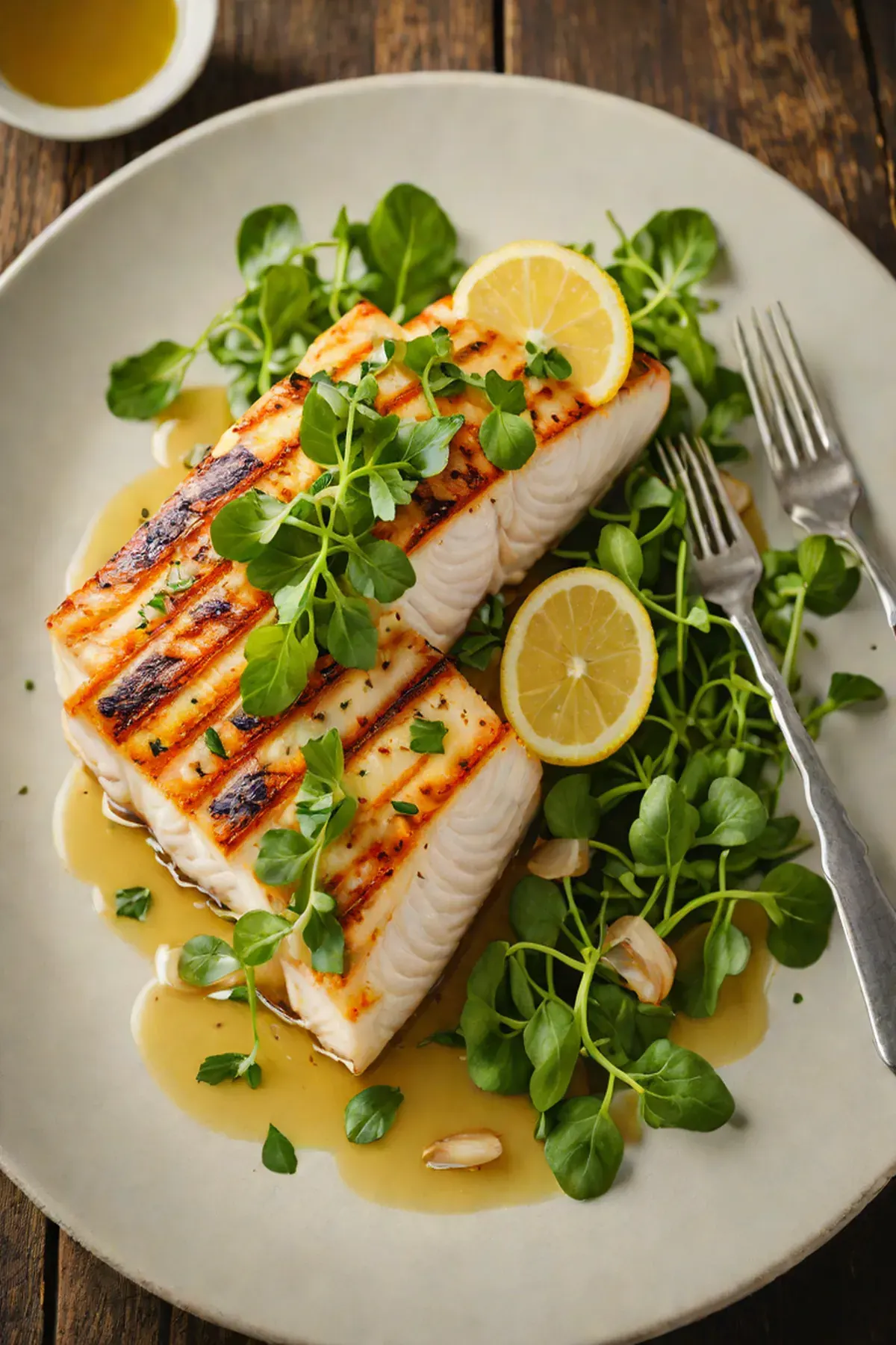 This is one of my favorite weeknight dinners because it comes together in just thirty minutes. Grilled halibut with watercress is elegant enough for guests but simple enough for a busy Tuesday night. The halibut fillets cook quickly on the grill while you prepare a vibrant watercress salad with shallots, radishes, and a bright lemon vinaigrette. Watercress is packed with vitamins and minerals that support bone health, making this dish as nourishing as it is delicious. The combination of tender fish and peppery greens creates a perfectly balanced meal that feels indulgent without requiring any complicated techniques.