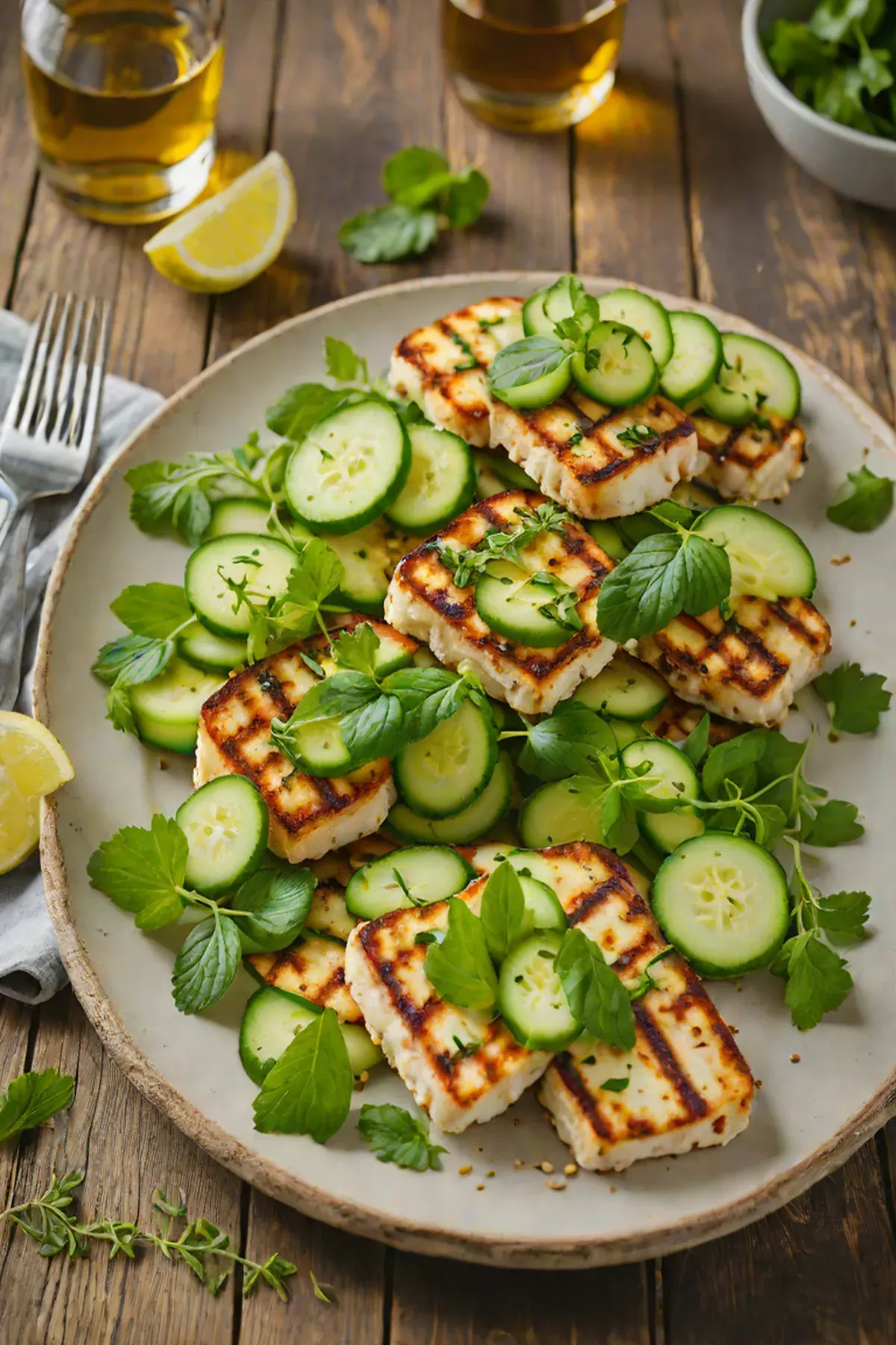 Serve the grilled Halloumi slices over the cucumber salad.