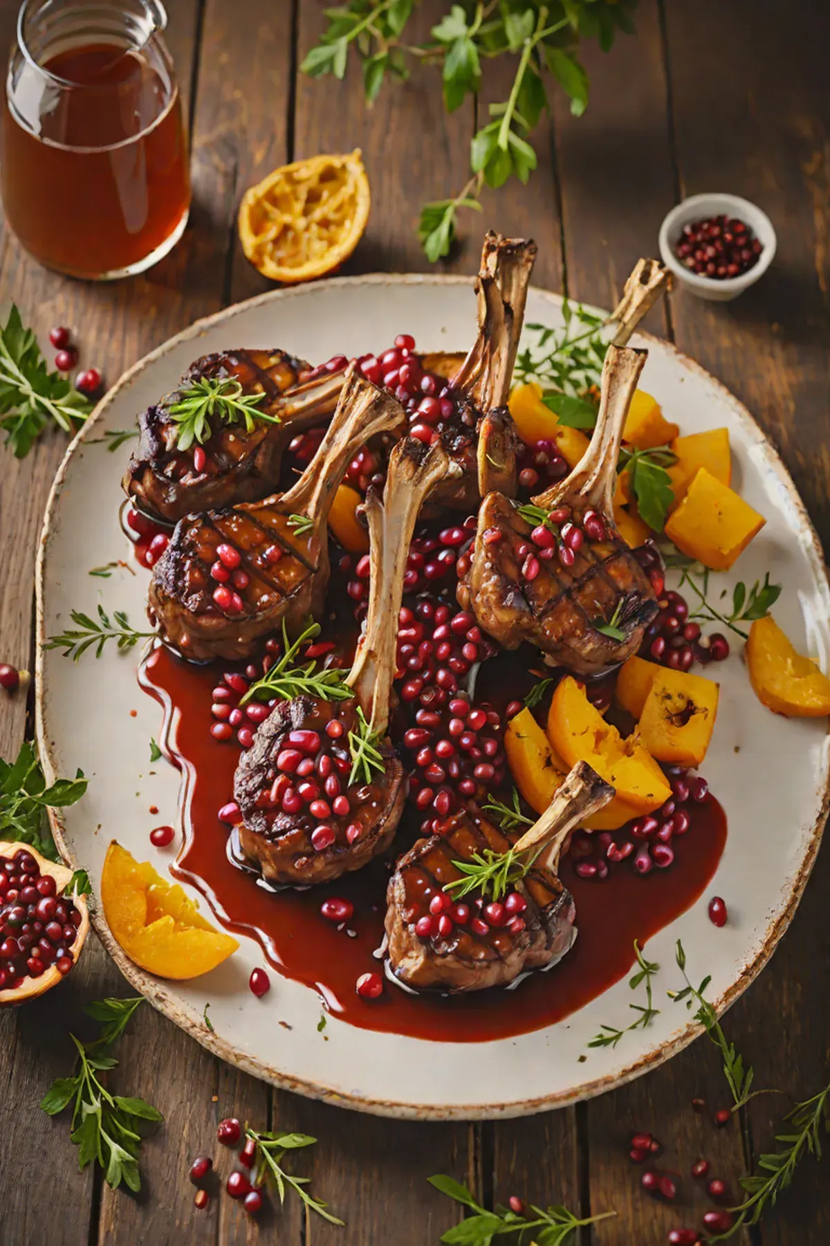 Arrange roasted pumpkin cubes on serving plates, top with lamb chops, and drizzle with pomegranate glaze. Garnish with fresh pomegranate seeds and chopped mint.
