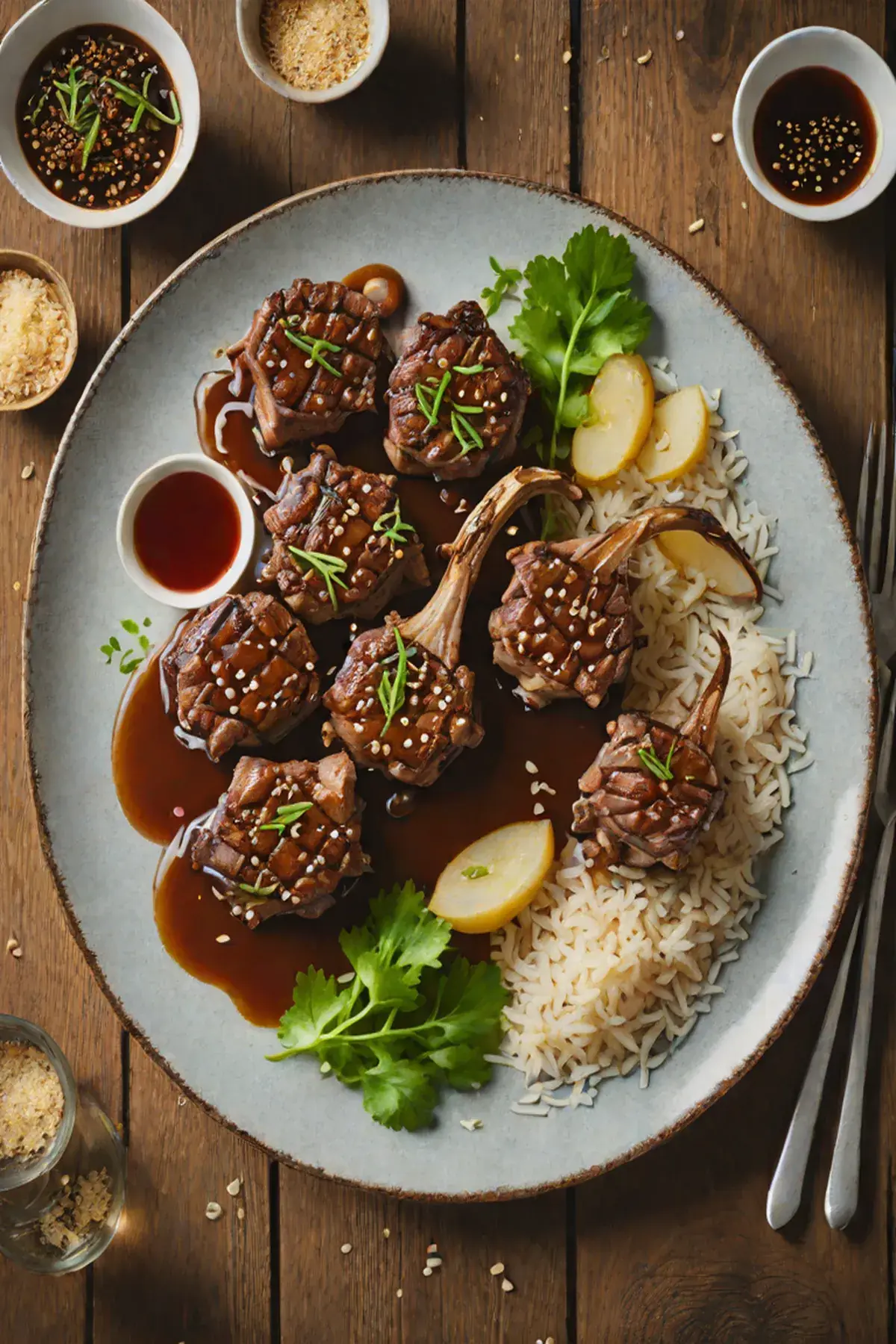 Arrange grilled daikon on a platter, top with lamb chops, drizzle with any remaining glaze, and garnish with toasted sesame seeds and sliced scallions. Serve immediately.