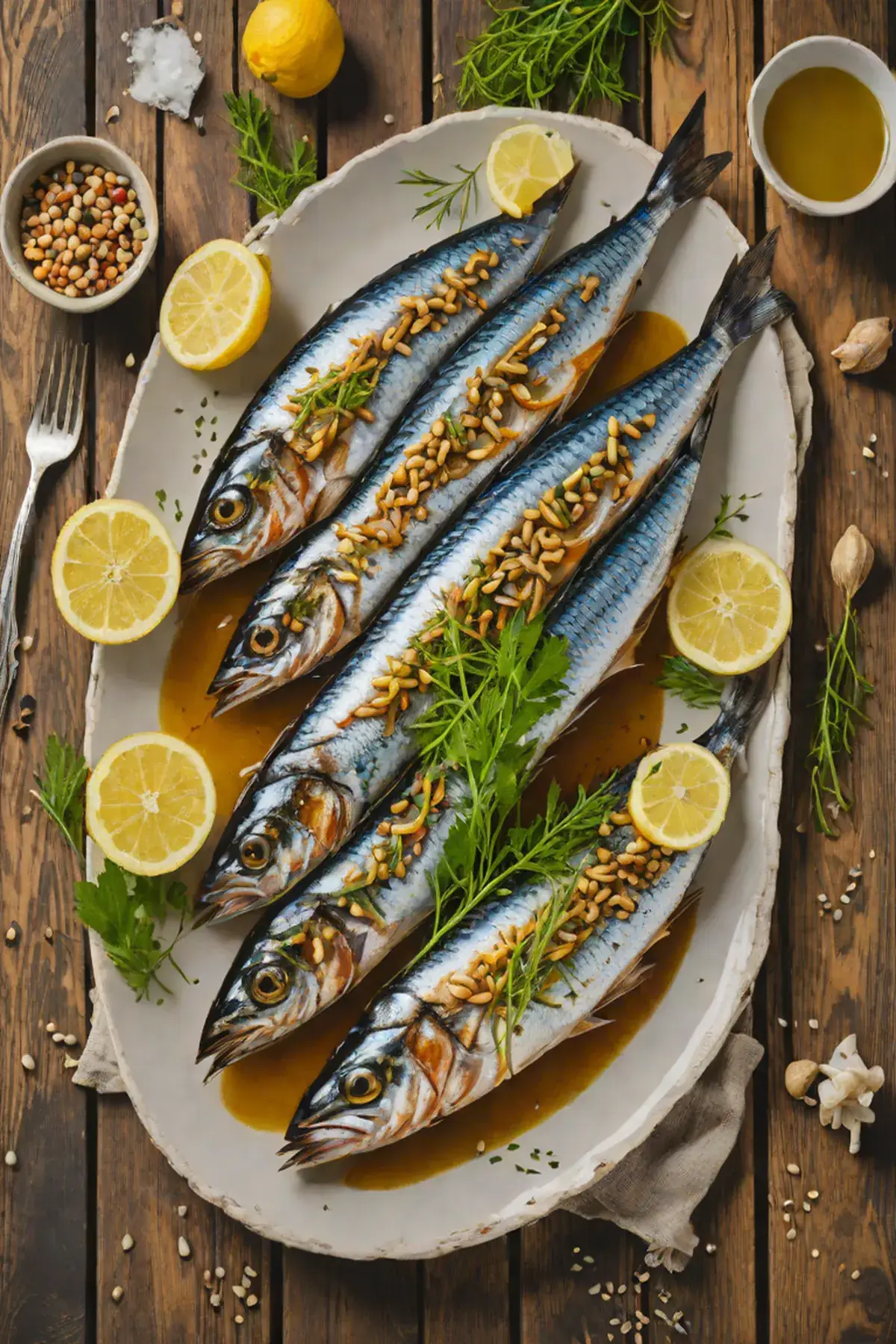 In a small bowl, whisk together the remaining 2 tablespoons of olive oil, minced garlic, white wine, chopped dill, parsley, and toasted fennel seeds. Squeeze the juice from one lemon half into the mixture and stir gently.