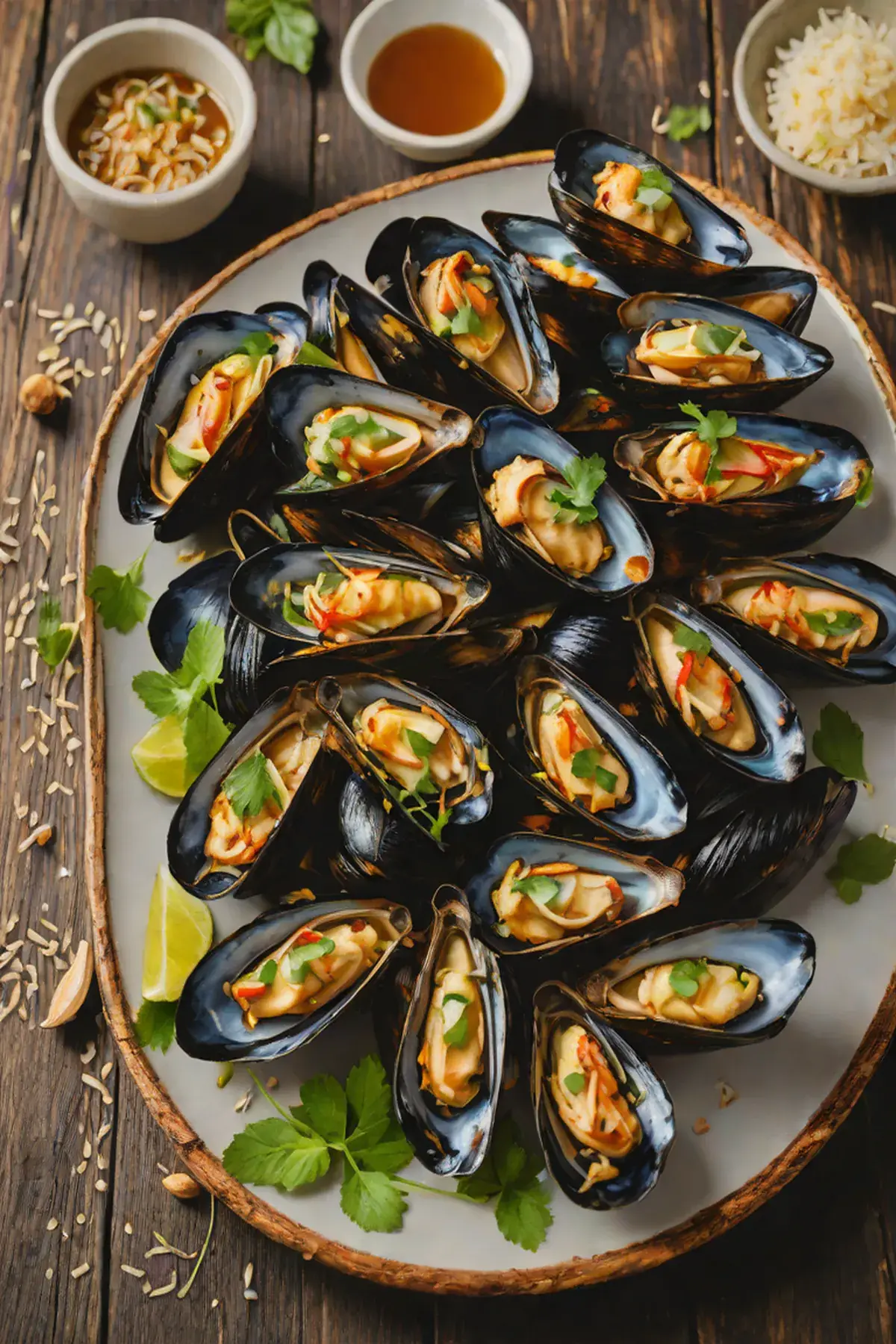 Transfer grilled mussels to a serving platter and drizzle any remaining marinade over them. Garnish generously with green onions and fresh cilantro.