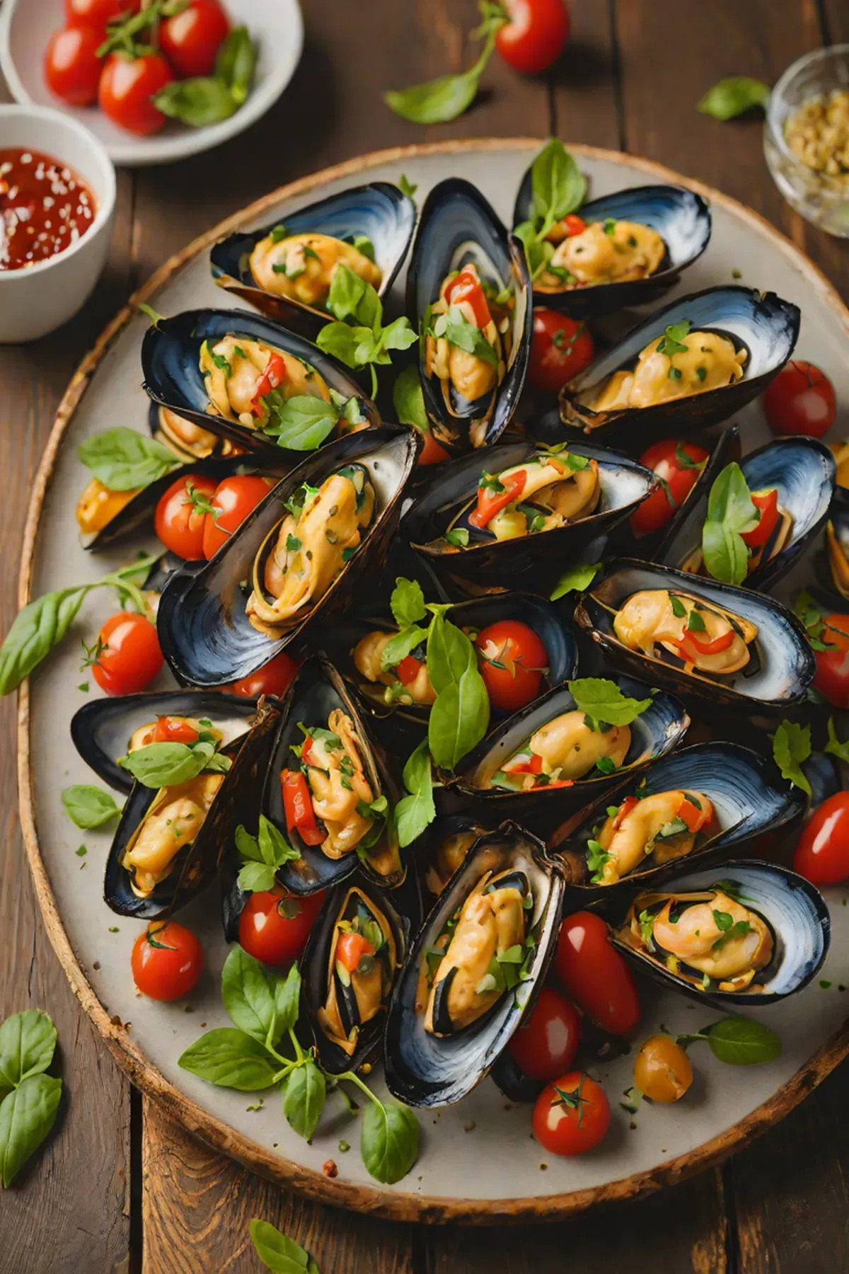 Spoon the warm tomato compote generously over the grilled mussels, scatter the reserved basil leaves on top, and serve immediately with crusty bread for soaking up the delicious sauce.