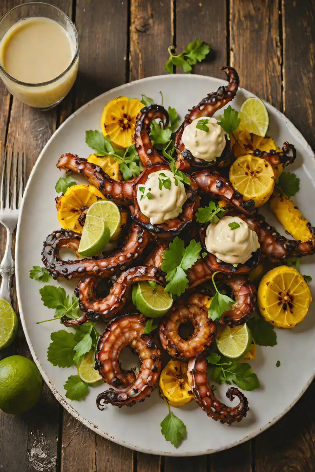 Grilled Octopus with Plantain and Charred Lime Aioli