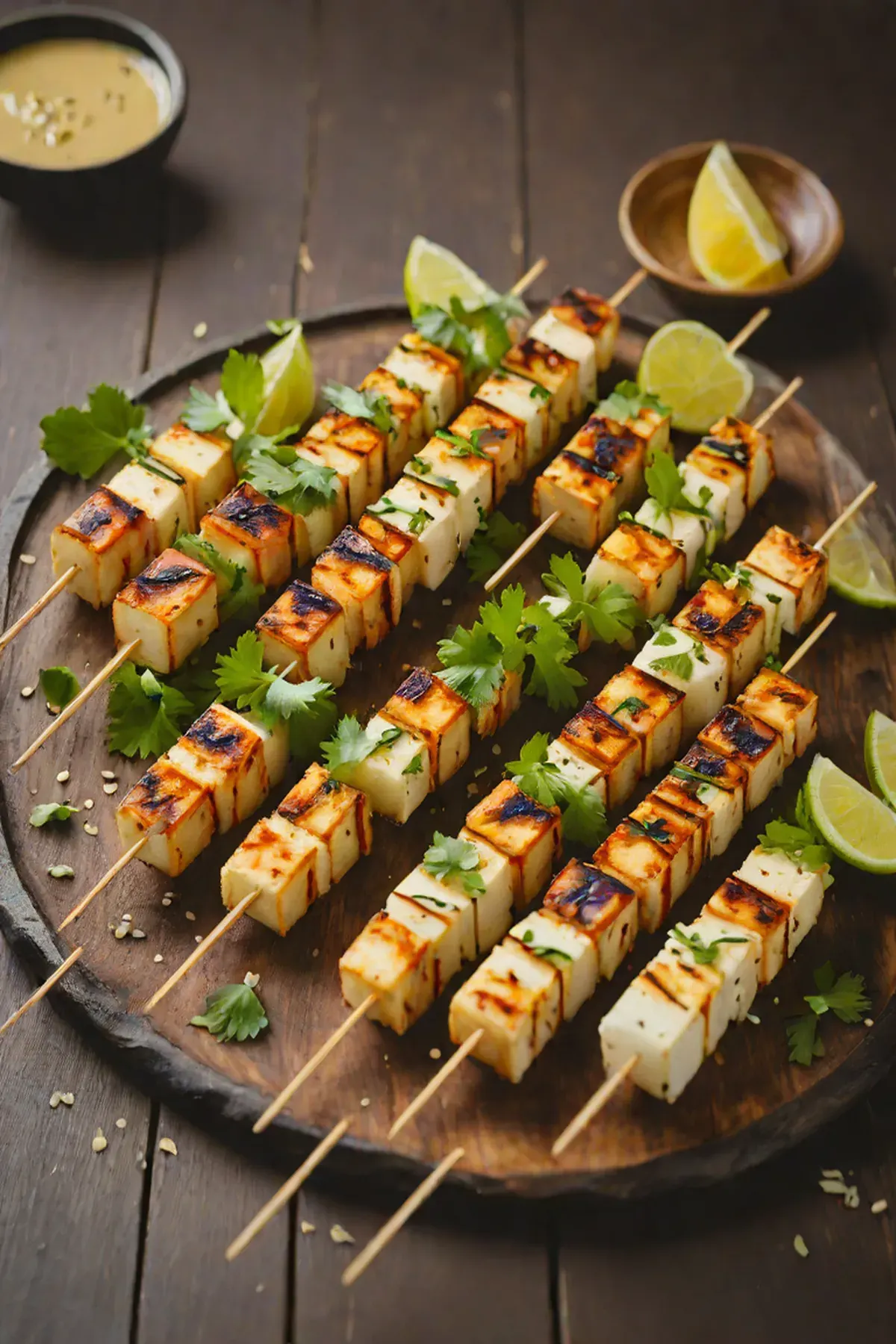 Grill the skewers for 10-12 minutes, flipping every 2 minutes, until paneer is golden brown and daikon is tender.
