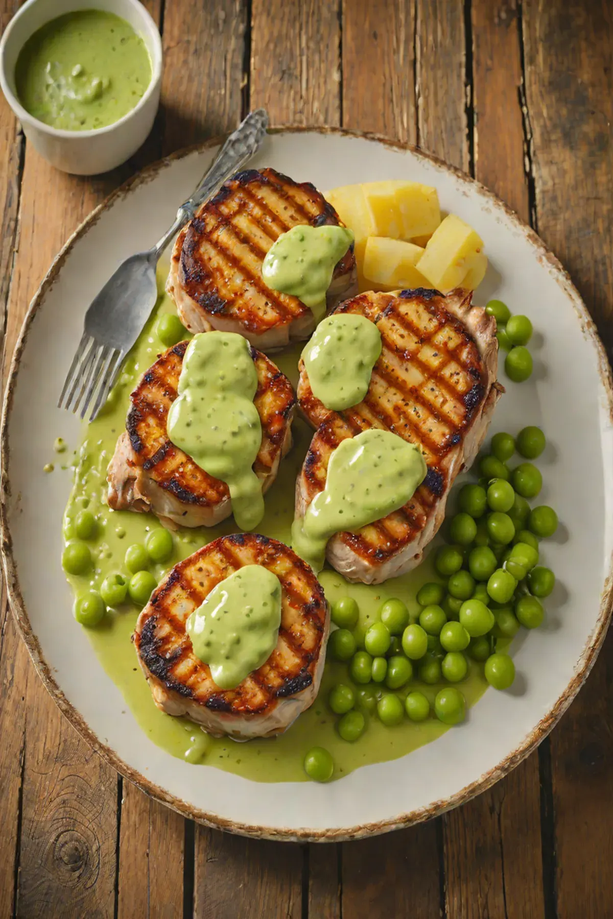 Grilled Pork Chops with Creamy Pea Sauce