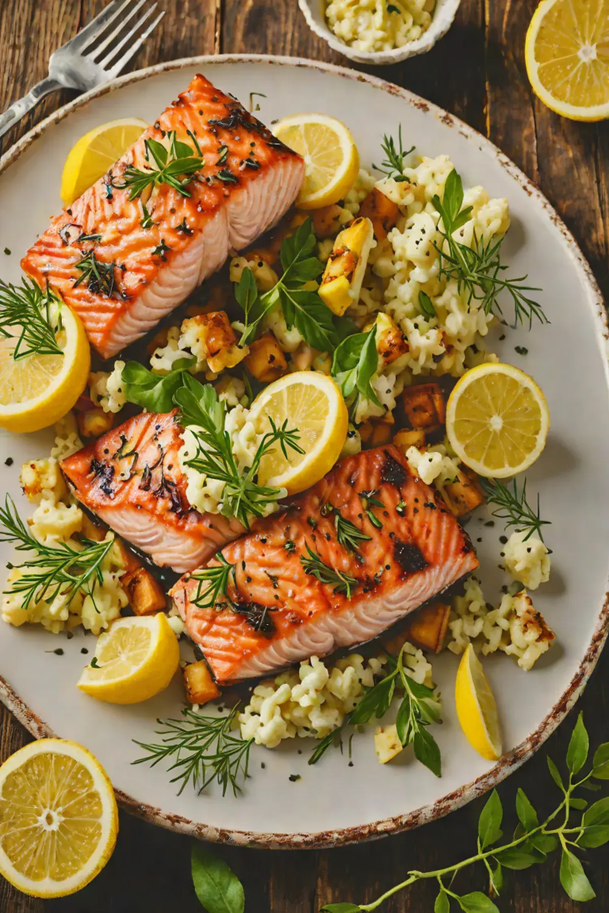 Transfer cauliflower steaks to serving plates and drizzle with the sage-butter mixture. Top with salmon fillets and finish with fresh lemon juice.