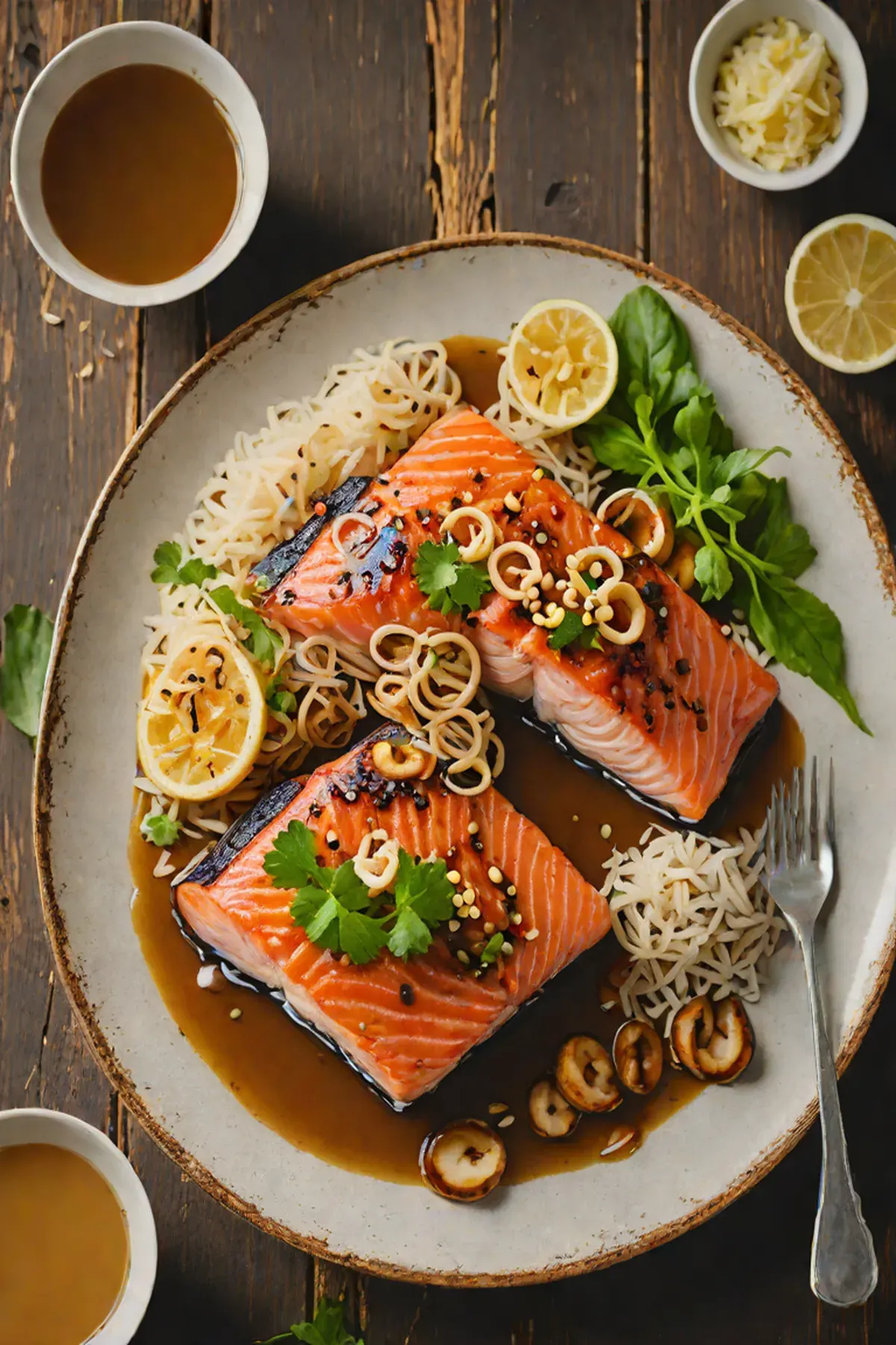 Grilled Salmon with Lotus Root and Ginger-Miso Glaze