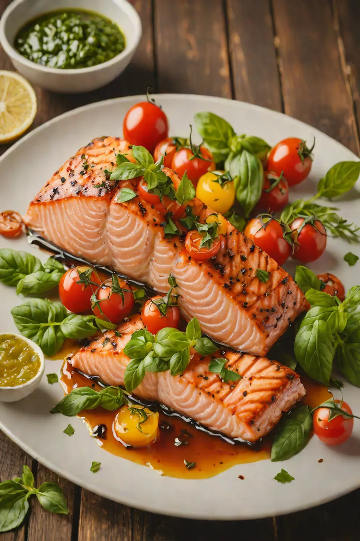 Transfer grilled salmon to serving plates and spoon the warm tomato compote over each fillet. Drizzle generously with basil oil and serve immediately.