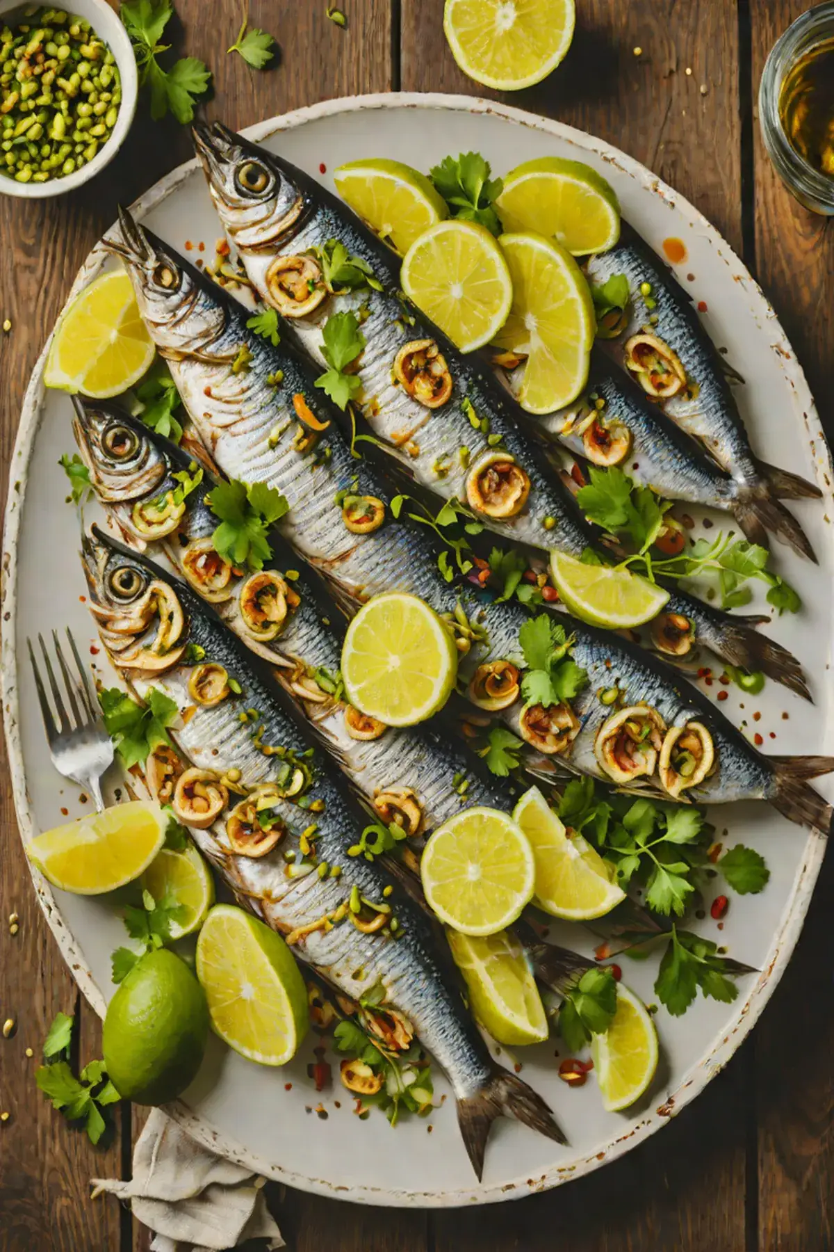 Garnish each plate with fresh microgreens and lemon slices. Serve immediately while the sardines are still warm.