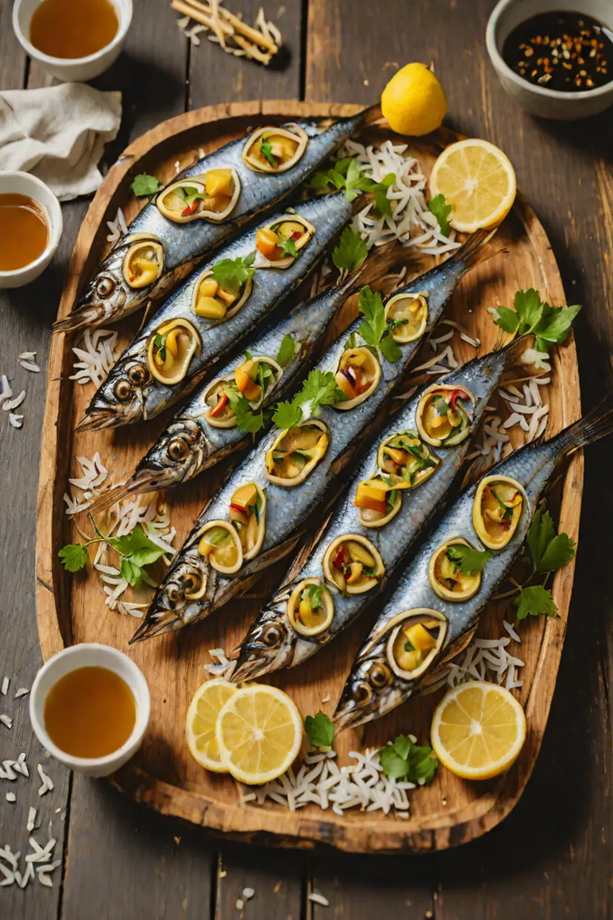 Transfer grilled sardines to the platter with bamboo shoots. Drizzle any remaining glaze over the fish and vegetables. Scatter minced garlic and spring onion pieces over the dish.
