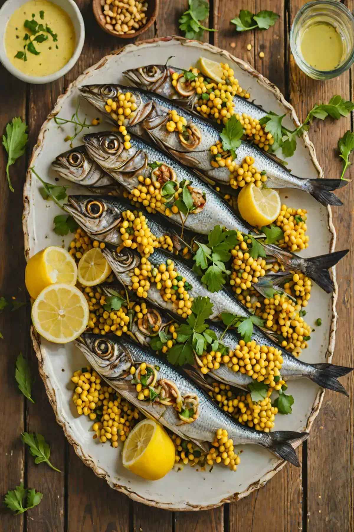 Transfer grilled sardines to a serving platter. Top with a generous dollop of lemon butter and scatter charred corn kernels around them.