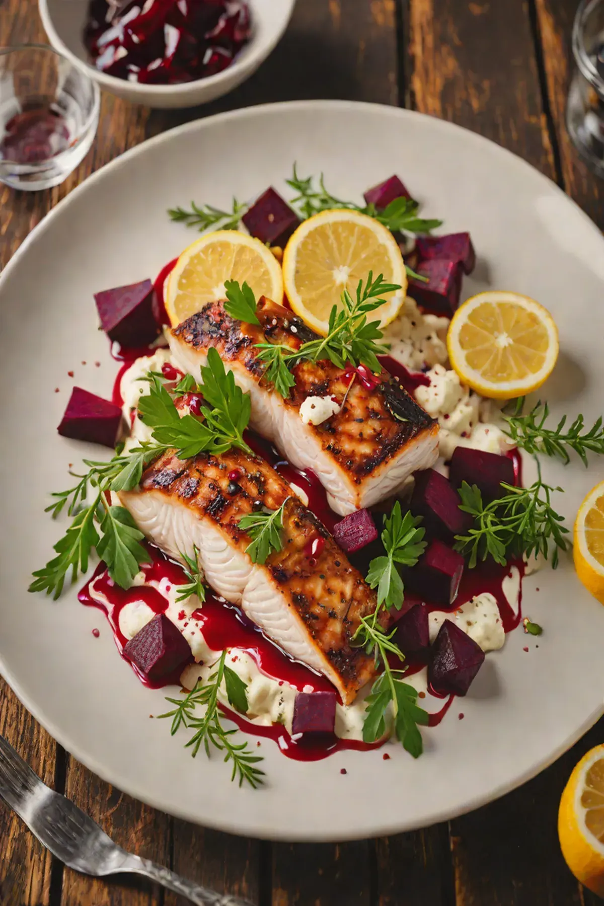 Grilled Sea Bass with Beetroot and Horseradish Cream