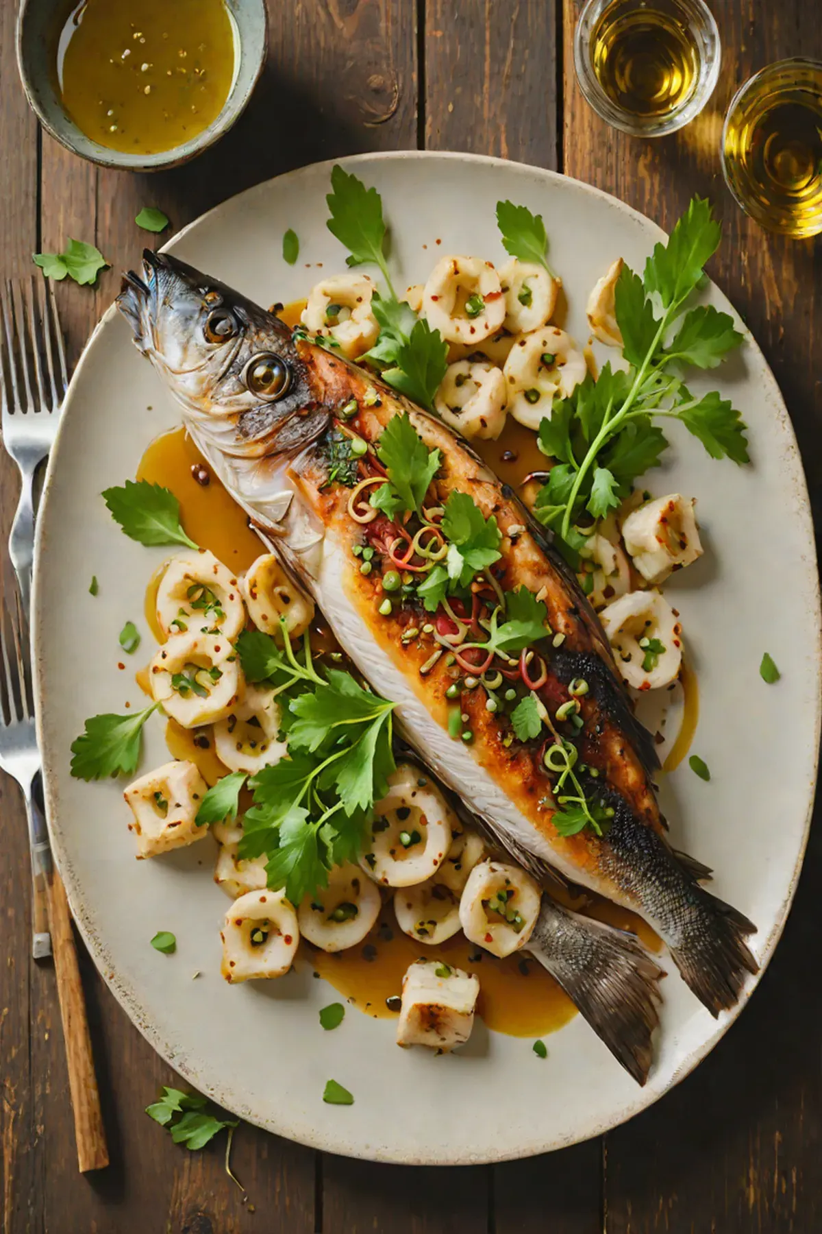 Grilled Sea Bass with Lotus Root and Ginger-Scallion Oil