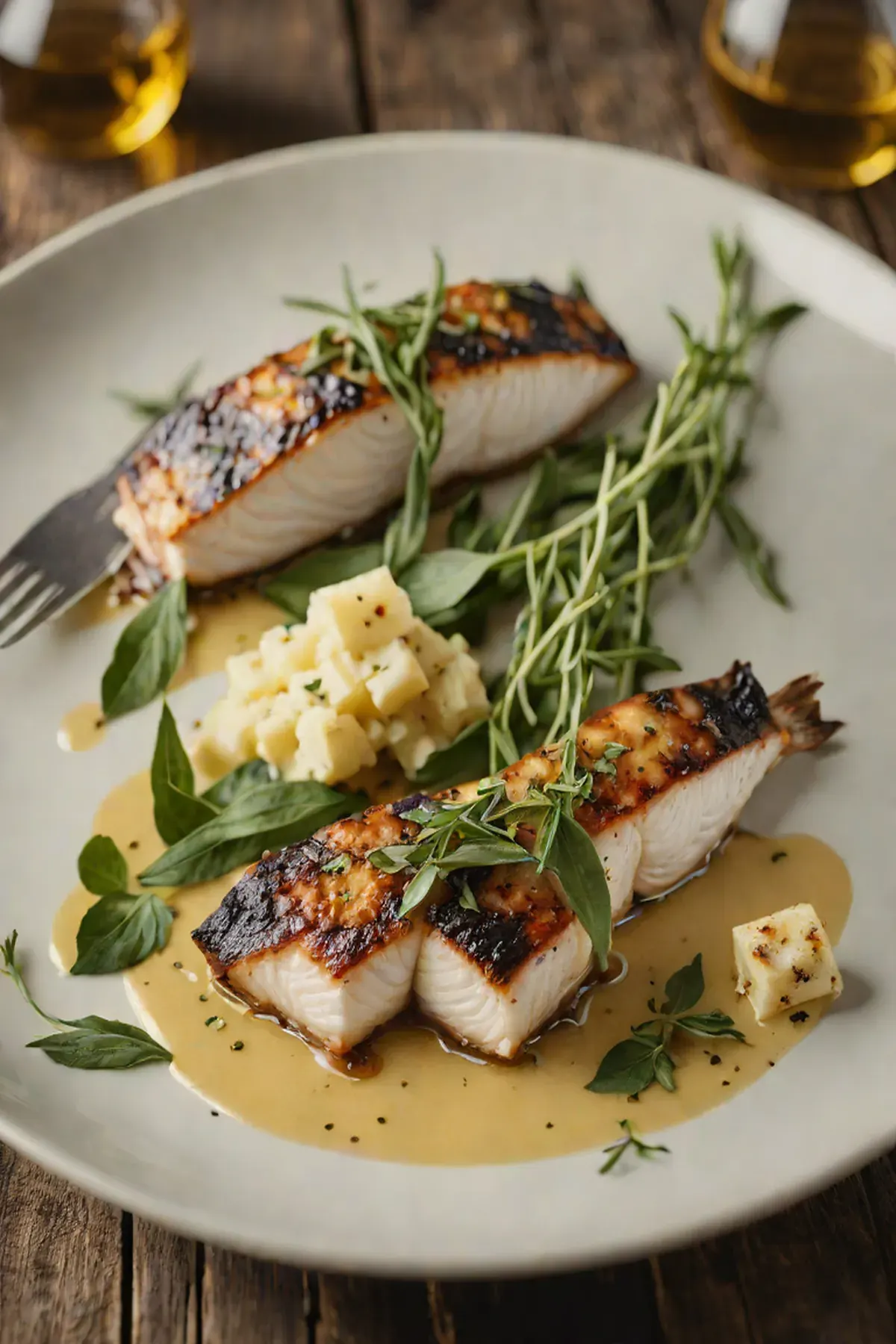 Drizzle the garlic-sage infused oil around the plate, top each fillet with crispy sage leaves and a fresh thyme sprig, then finish with a squeeze of lemon juice and a light dusting of sea salt.