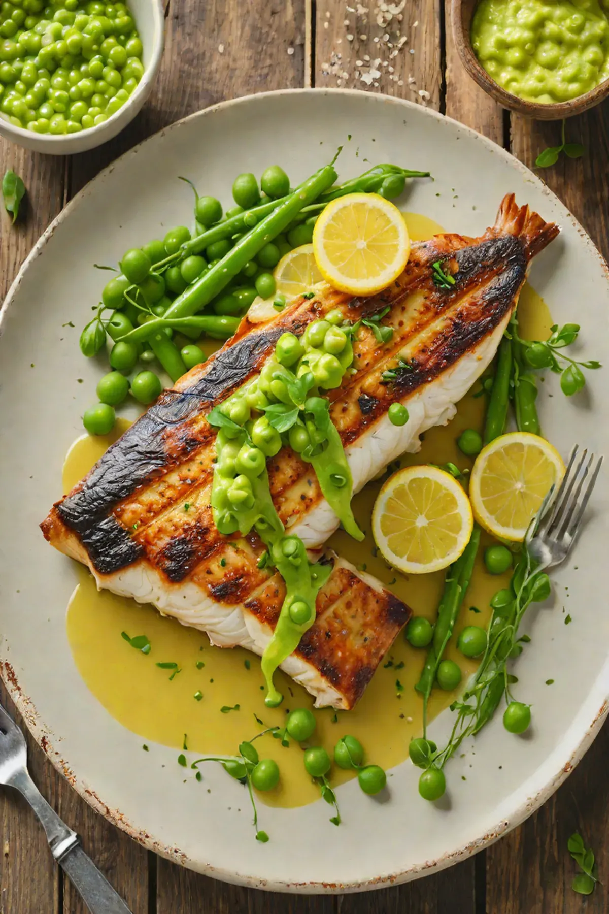 Grilled Sea Bass with Pea and Lemon Butter Sauce