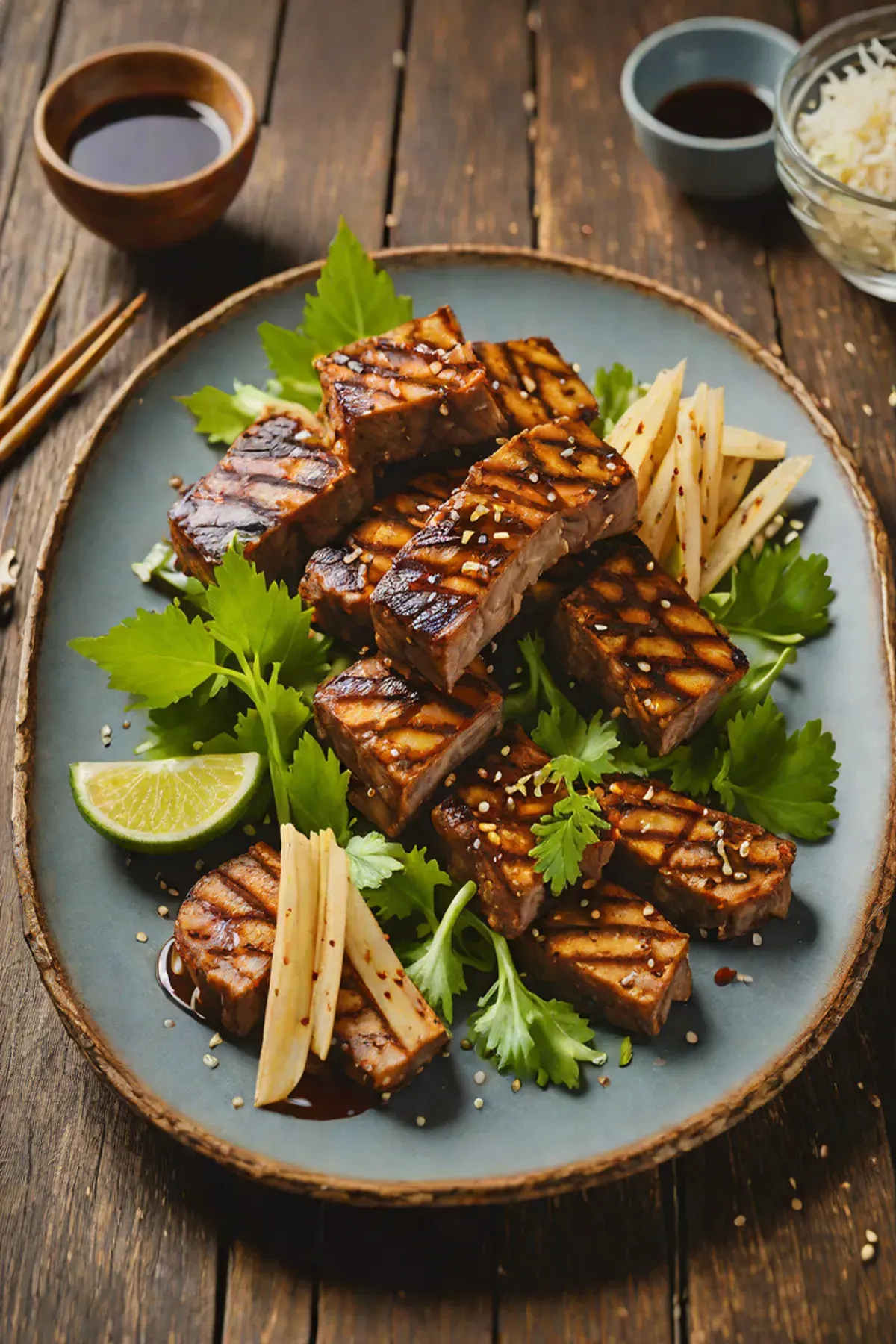 Remove the seitan from the grill and let it rest for 2 minutes before serving alongside the grilled bamboo shoots.