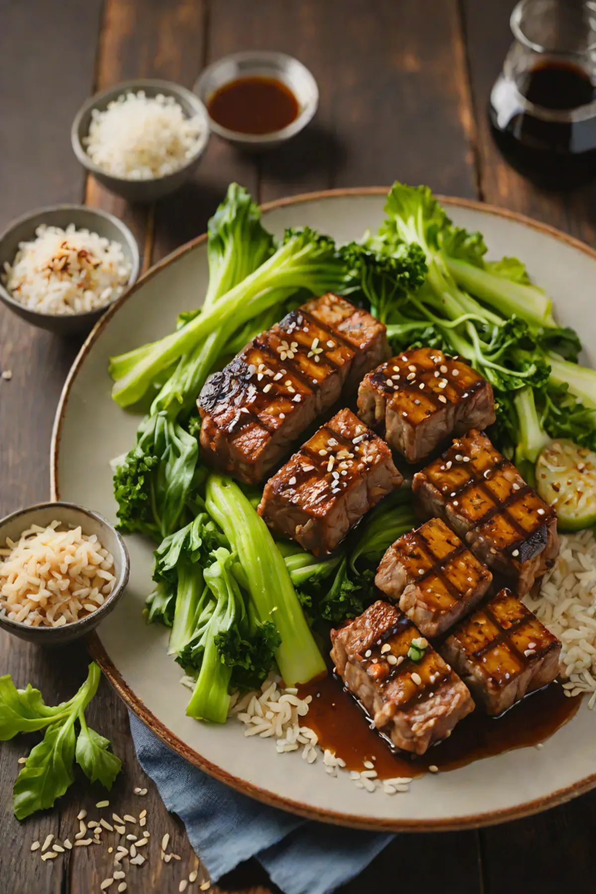Arrange grilled seitan and pak choi on serving plates. Drizzle with the warm glaze sauce.