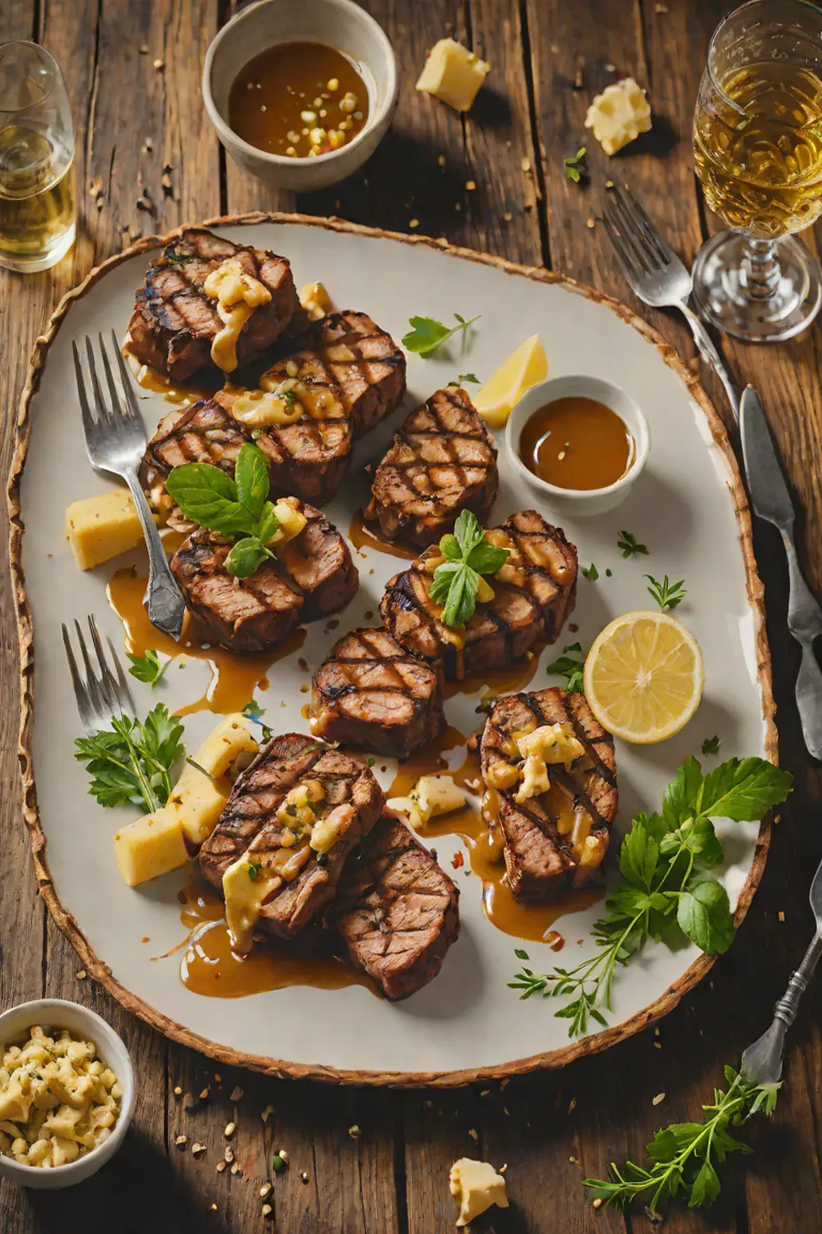Top each grilled seitan steak with a generous dollop of herb butter, allowing it to melt over the warm surface.